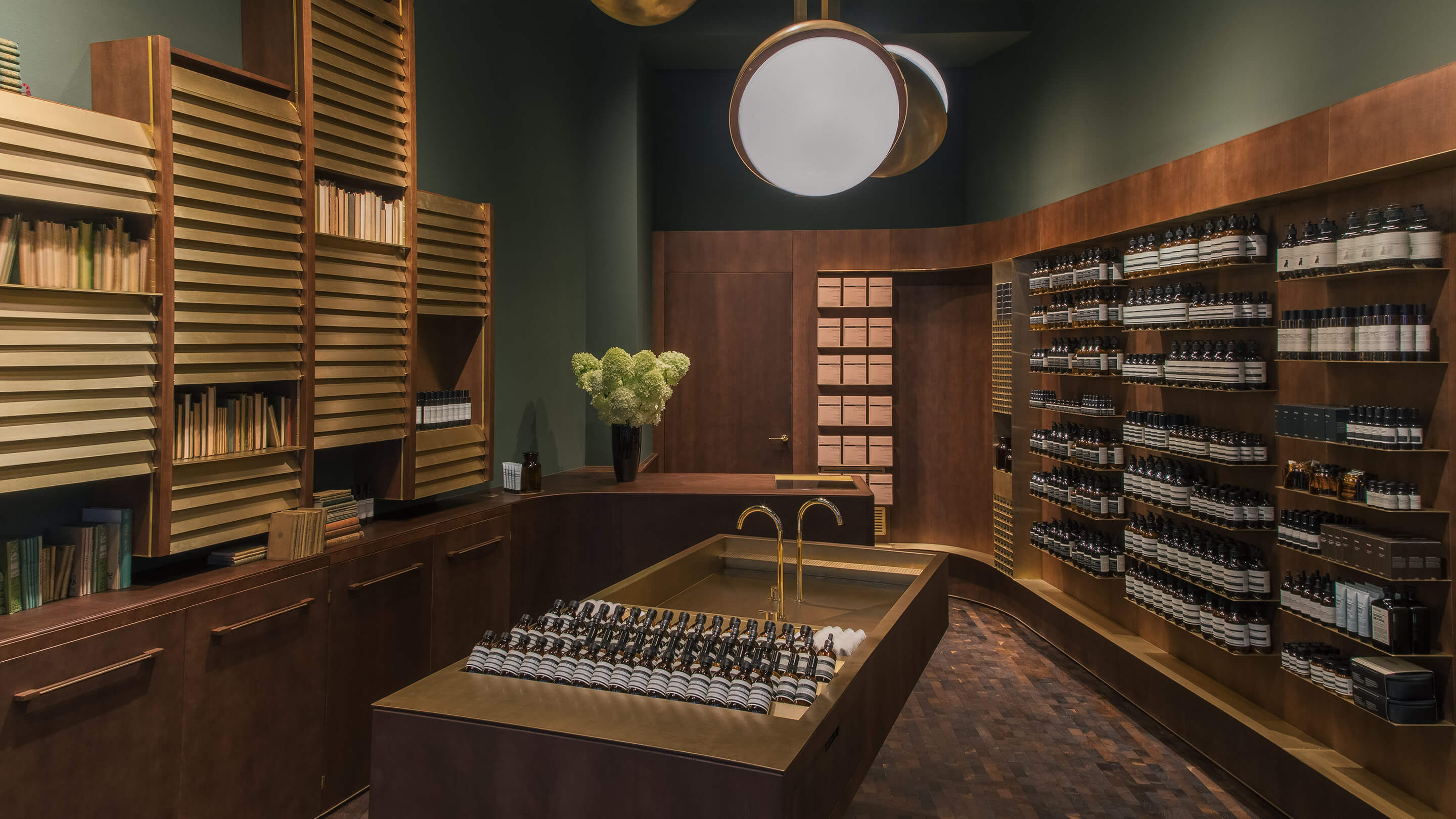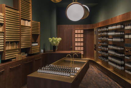 Aesop’s first Austrian signature store, in Vienna’s historic centre, is strongly influenced by the city’s early 20th-century architecture – particularly the work of Adolf Loos. Created by the company’s in-house Design Department, the 32-square metre space strikes a balance between contemporary minimalism and the ornate Art Deco elements of its surrounds.