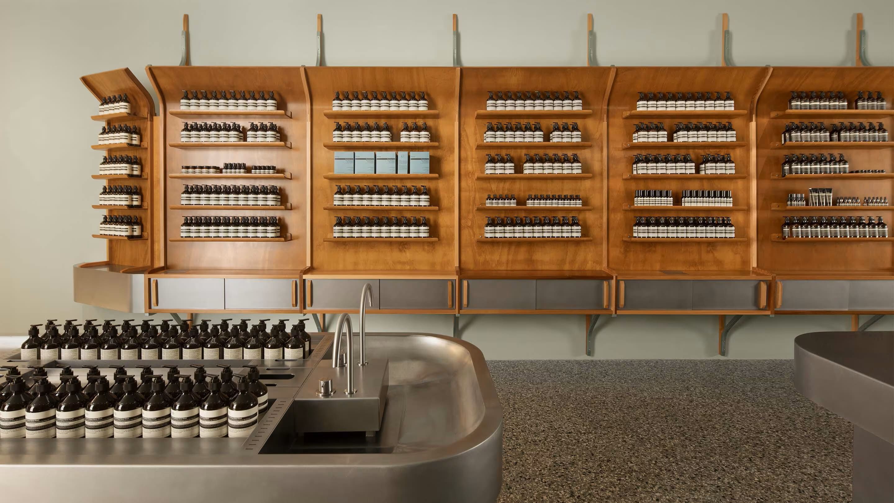 Stainless steel and lacquered wood—two traditionally industrial materials, here striking unexpectedly warm and inviting notes—are in harmony throughout. The former is used for a large, curved basin and a counter which stand in the centre of the room, offering a cooling tactility for customers arriving on a balmy Sydney day. The latter forms product shelves reminiscent of rowing boats that run the lengths of the walls, the nautical timber conjuring images of a leisurely boat ride along the river.