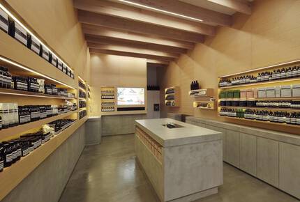 An artisanal approach informed the design, employing simple forms crafted primarily from matte-textured Victorian Ash. The store’s frame forms an elegant enclosure that filters bright external light, creating a soft palette and an immersive space that is intimate and calm.