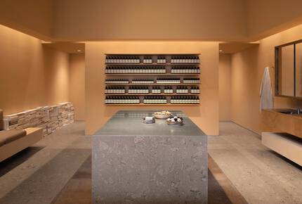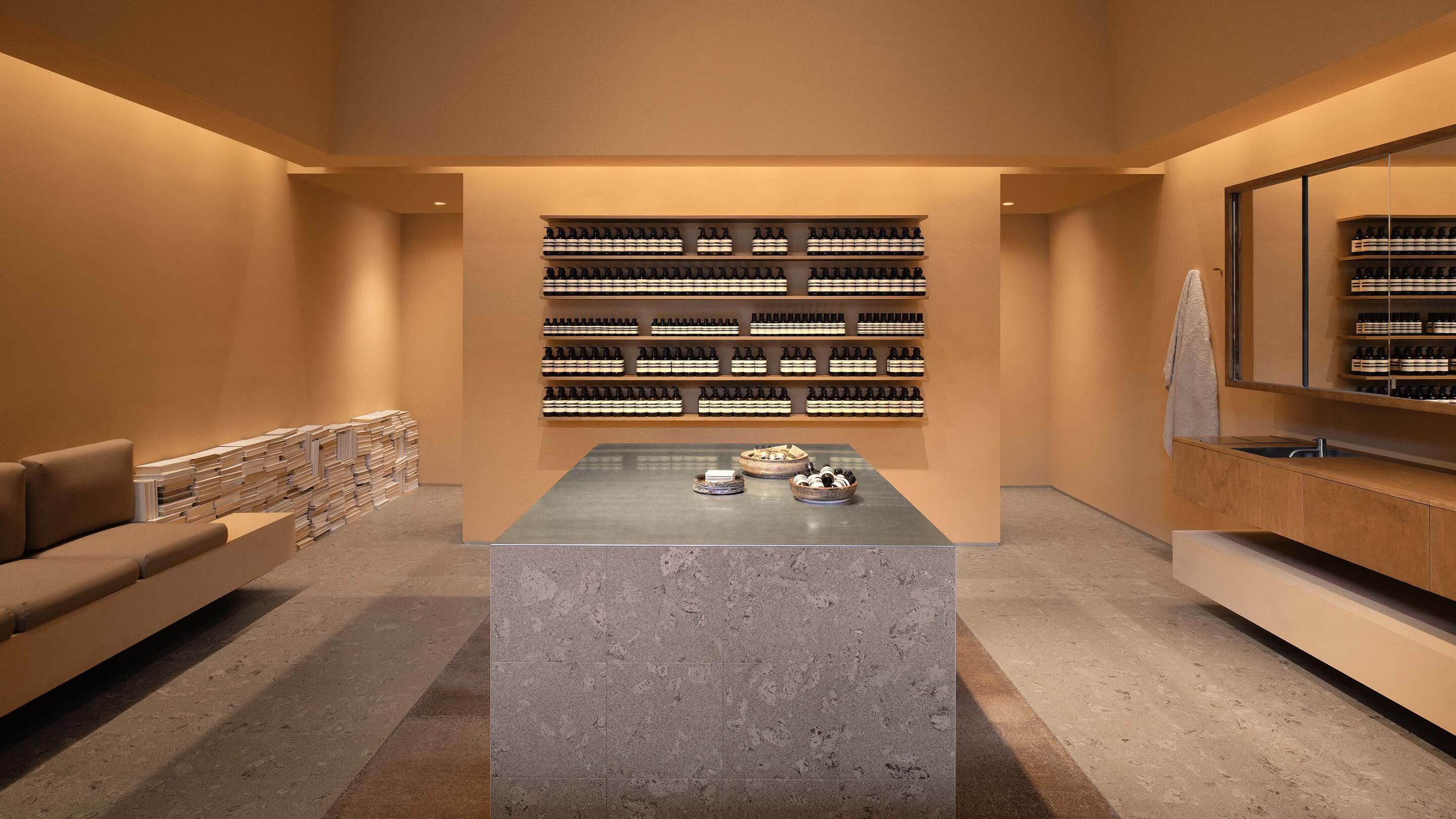 A sense of protection and separation is evoked from the entrance, with a soft-textured brown curtain drawn across the window of the store. The same warm hue is employed throughout the space, echoed in wooden shelving and cork tiling that covers the floors and basins. Articulated walls are coated in the same russet shade, with a matte, mineral-finish paint.