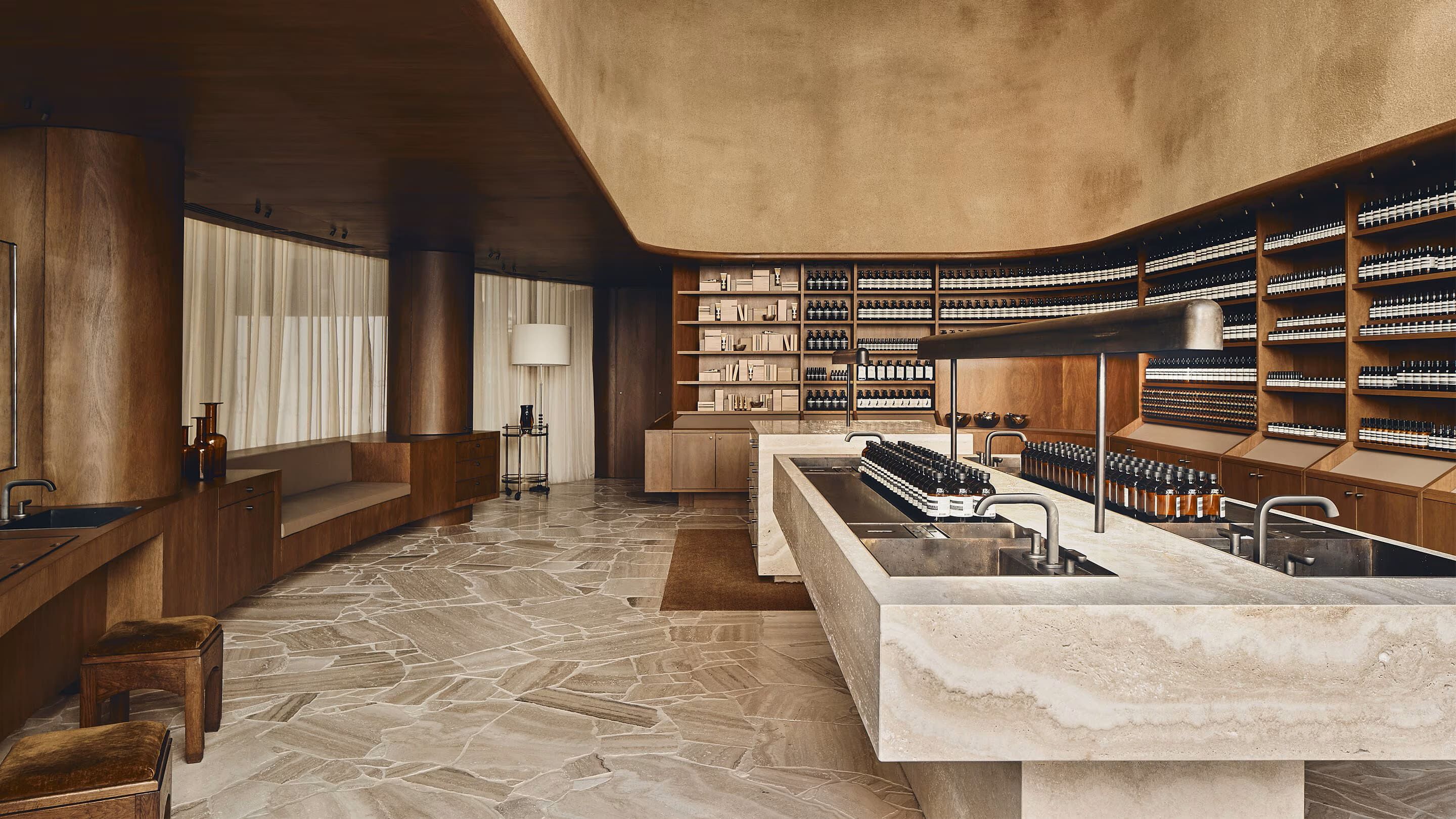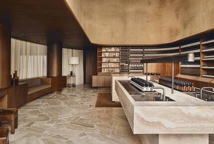 As one steps in from the wide boulevard, the high, vaulted ceiling engenders quiet reverence, its grainy surface coated in salvaged and crushed Aesop bottles mixed with render. Australian Blackbutt timber wraps the curved perimeter of the store: on one side, amber vessels stand in for books on generous shelves; on the other, timber-shrouded individual basins with low lighting are reminiscent of writing desks. On comfortable chairs, visitors are invited to leaf through the Aesop Book, or simply repose in serene contemplation. A Fragrance Armoire allows customers to imbue a piece of clothing with their aroma of choice, and thus take an olfactory memento of the experience into the outside world.