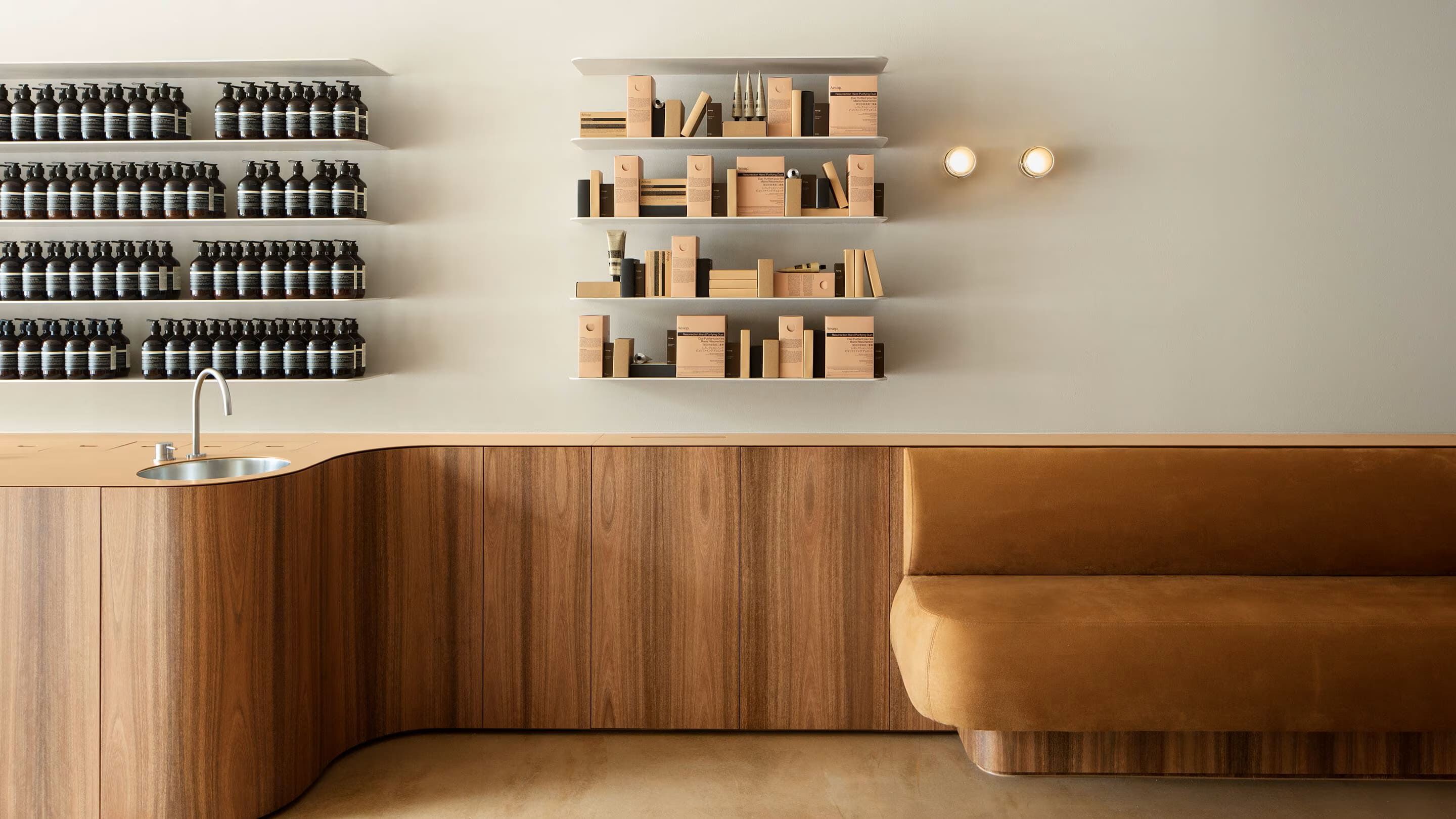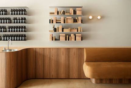 The second incarnation of Aesop’s South Yarra store explores the architecture of reclining and conversing, and includes a luminous facial treatment room. Conceived in-house and inspired by Antti Lovag’s concept of habitology, where ‘conviviality is a circular phenomenon,’ the design creates curves within rectangles, soft edges within hard spaces, and organic movement against structured pathways.