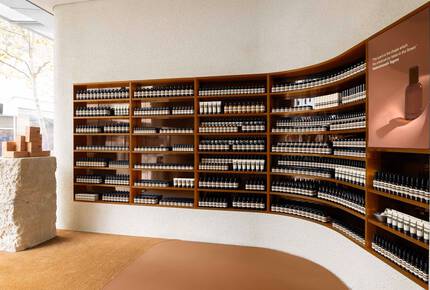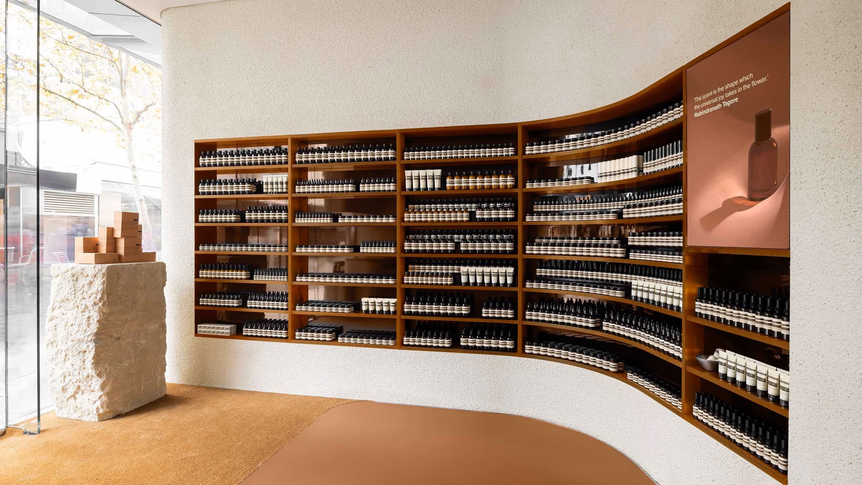 Whadjuk people of the Noongar nation have inhabited and tended to Boorloo—Perth—for at least 45,000 years. We pay deepest respects to Noongar Elders past and present, and acknowledge that sovereignty over these lands has never been ceded. In this spirit of reverence, when it came time for the original Aesop Perth City to relocate, our in-house design team sought inspiration for the new interior from Boorloo’s geology and landscape: milky water pools in defunct quarries; the West Australian sunset warming rust-red boulders; dusk light reflecting on the surface of salt lakes.