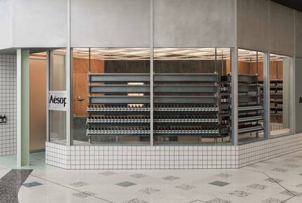 Set in a light-filled corner of Westfield Booragoon, in the southern suburb of Perth, the entirely glazed Aesop Booragoon uses materials inherited from industry to create a scenographic space—part neighbourhood boutique, part gallery. Inspired by functional modernism, the design embraces the use of modular systems suited to industrial production methods—a celebration of the poetics of the technical object.