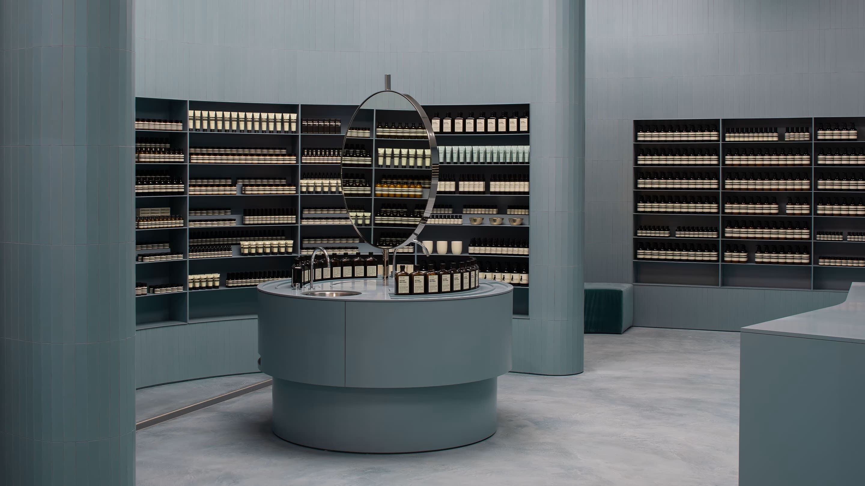 As one journeys through the store, an amphitheatre of skincare opens up: a generous arching wall ensconces the visitor while a central counter reiterates the circular language, its moon-like mirror pivoting between two individual basins.
