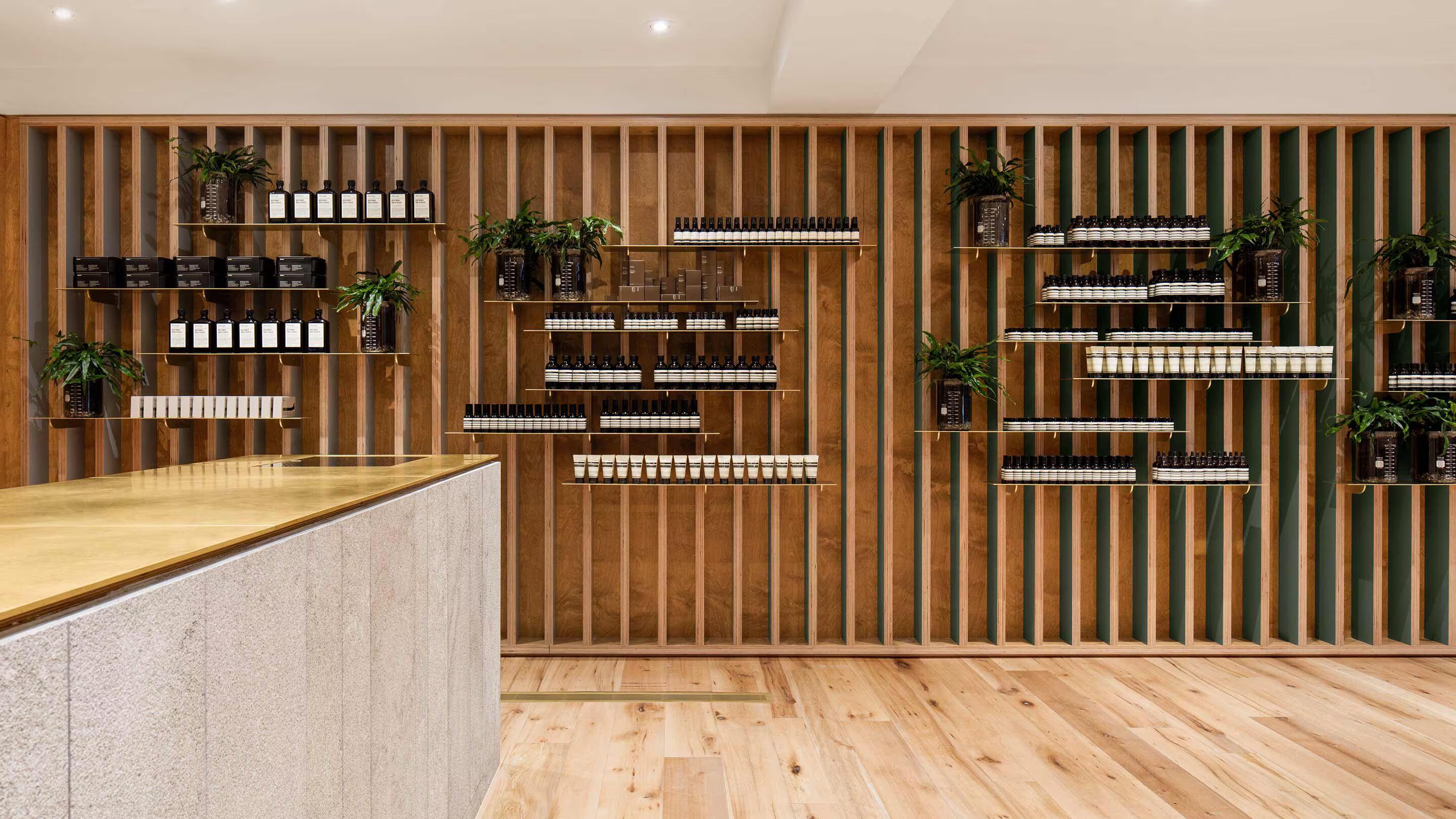 Products are displayed on thin brass shelving; positioned against the bright-hued backdrop, they appear almost to levitate within the intimate setting. Behind the retail area, the site accommodates a cleverly concealed back-of-house area comprising storage space, kitchen and meeting room.