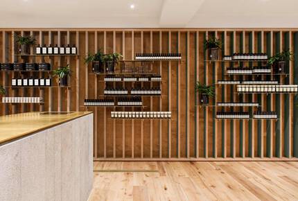 Products are displayed on thin brass shelving; positioned against the bright-hued backdrop, they appear almost to levitate within the intimate setting. Behind the retail area, the site accommodates a cleverly concealed back-of-house area comprising storage space, kitchen and meeting room.