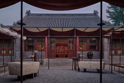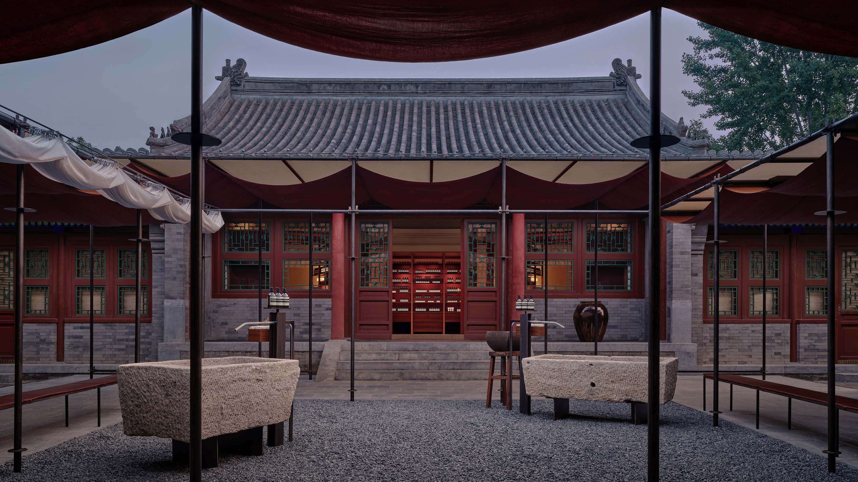 Stepping through the grand gateway, guests enter the expansive courtyard beneath fluttering silk, where the classic pergola is reimagined as a retractable structure draped in waterproof canvas and crimson xiangyunsha tea silk. This semi-outdoor area becomes the backdrop for a serene interplay of shadow and breeze. A duo of long benches crafted from glazed tiles frame a pair of immense recycled stone troughs reminiscent of the goldfish basins traditionally placed beneath pergolas. To one side, a tea station that recalls a marketplace wonton stall invites guests to engage in a moment of reflection and refreshment.