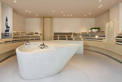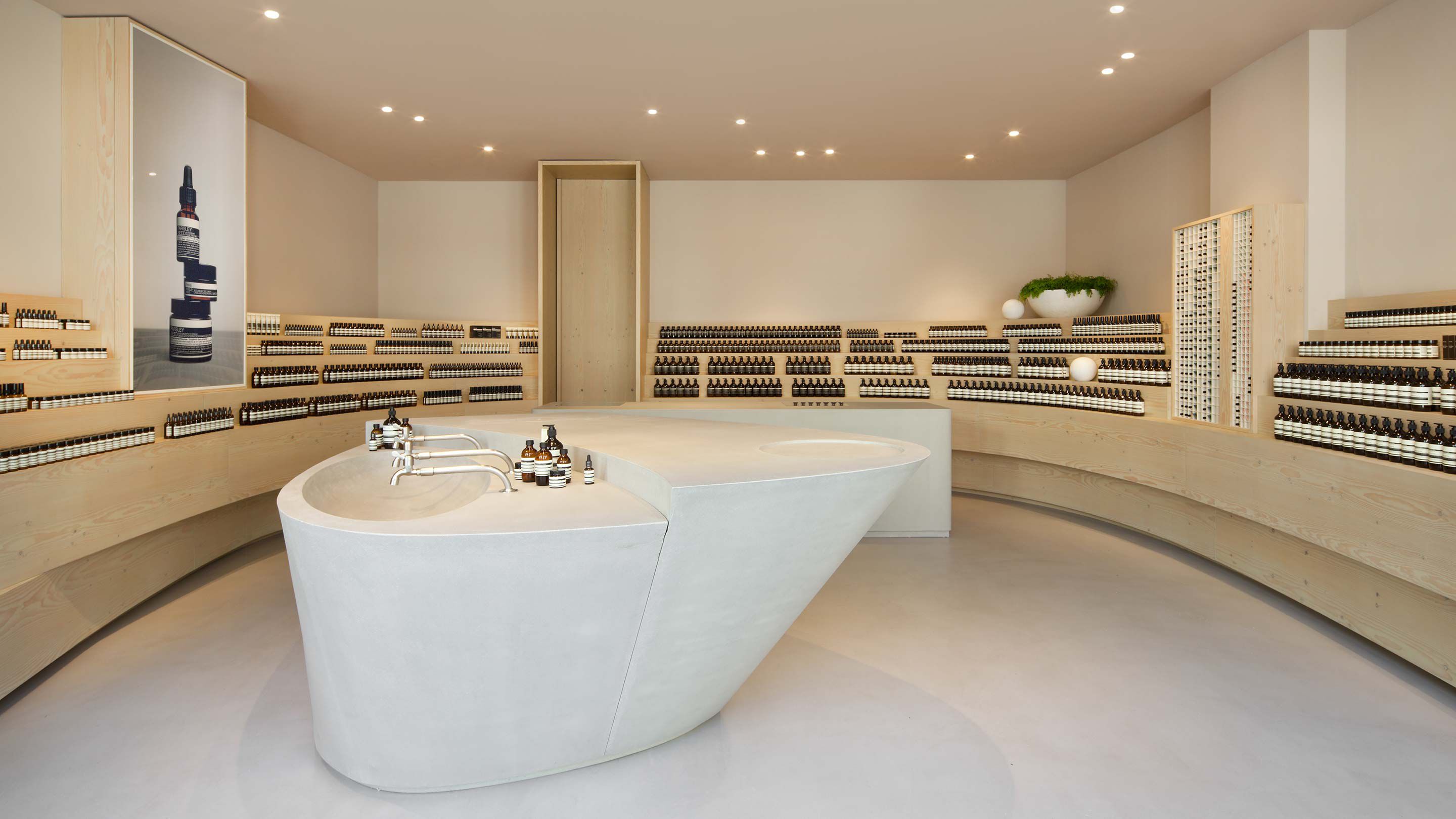 The space is the second in Germany to be created in collaboration with Norwegian integrated architecture and design practice Snøhetta; it was preceded by Aesop Fasanenstraße in Berlin. In harmony with the handsome pedestrian plaza in which the store is situated – host to a variety of markets and fairs – the design subtly blurs distinctions between interior and exterior, and effects subdued contrasts of materiality and form. Blonde-hued, tiered shelving crafted from Douglas Fir curves around the walls to effect a crescent suggestive of an amphitheatre beckoning audiences; embedded downlights on the ceiling mirror its form.