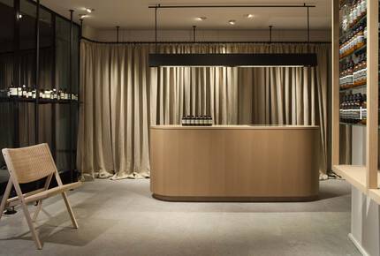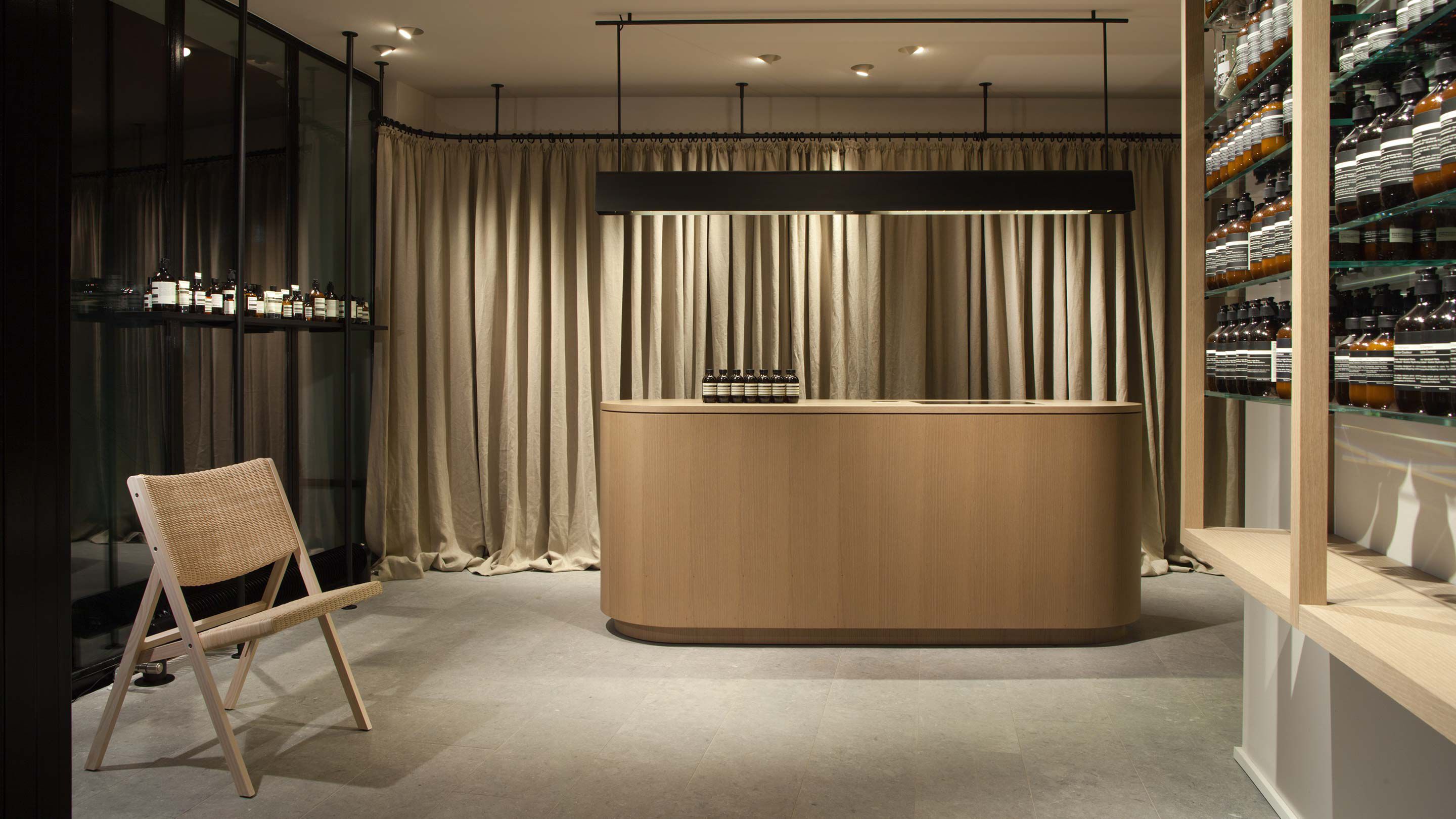 Display shelves are crafted from untreated European Oak and blackened steel – the latter referencing the store’s original cast-iron facade. Floor-length linen curtains hang in a discreet curve behind the point-of-sale counter.
