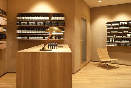 Referencing the city’s artistic heritage, the ground-floor retail area resembles the back of an artist’s canvas. Raw linen covers the walls and furniture, effecting a warm, calming atmosphere. Shelving, flooring and furniture are crafted from German Oak, a metaphor for the frame of the canvas; while an original steel staircase with emerald-green marble stairs spirals upwards to the second retail space.