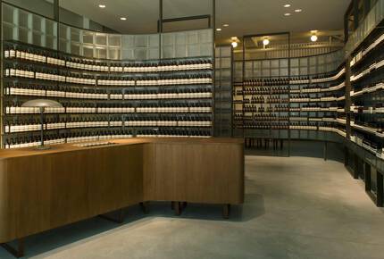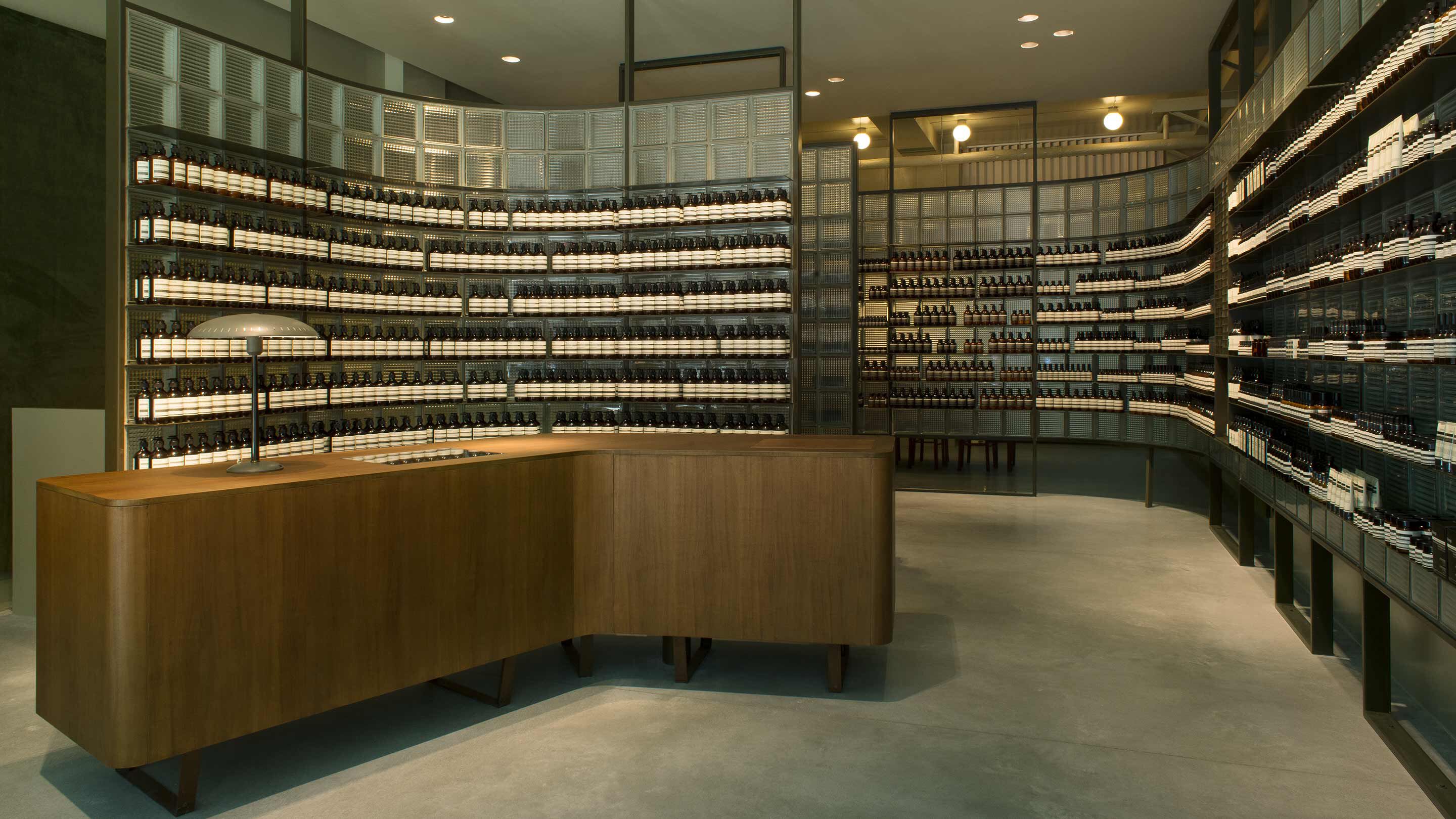 Within the rough concrete façade, the interior features green- and grey-hued walls lined with shelving composed of powder-coated metal and translucent glass tiles, reflective of the industrial uniformity that characterised Leipzig when Germany’s East and West were demarcated. In striking variation, the centrally positioned point-of-sale counter is crafted from oiled Plywood with rounded edges.
