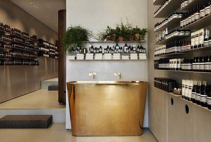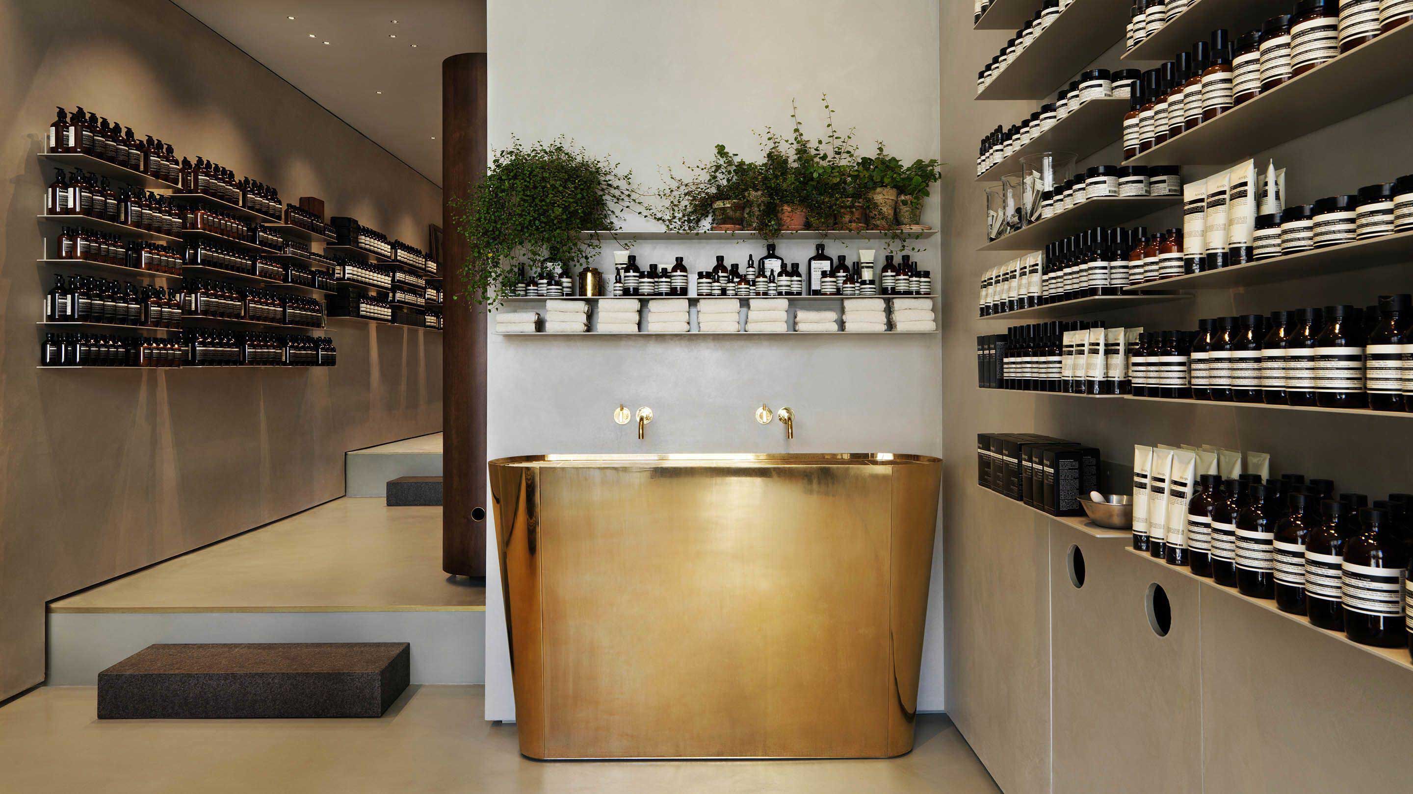 Pale greens and greys subtly encourage a reflective pace. Use of brass and timber recalls polished treasures of home decoration: a sculptural brass sink gleams like a beacon of warmth near the entry, while a Walnut sales counter with brass accents guides exploration.