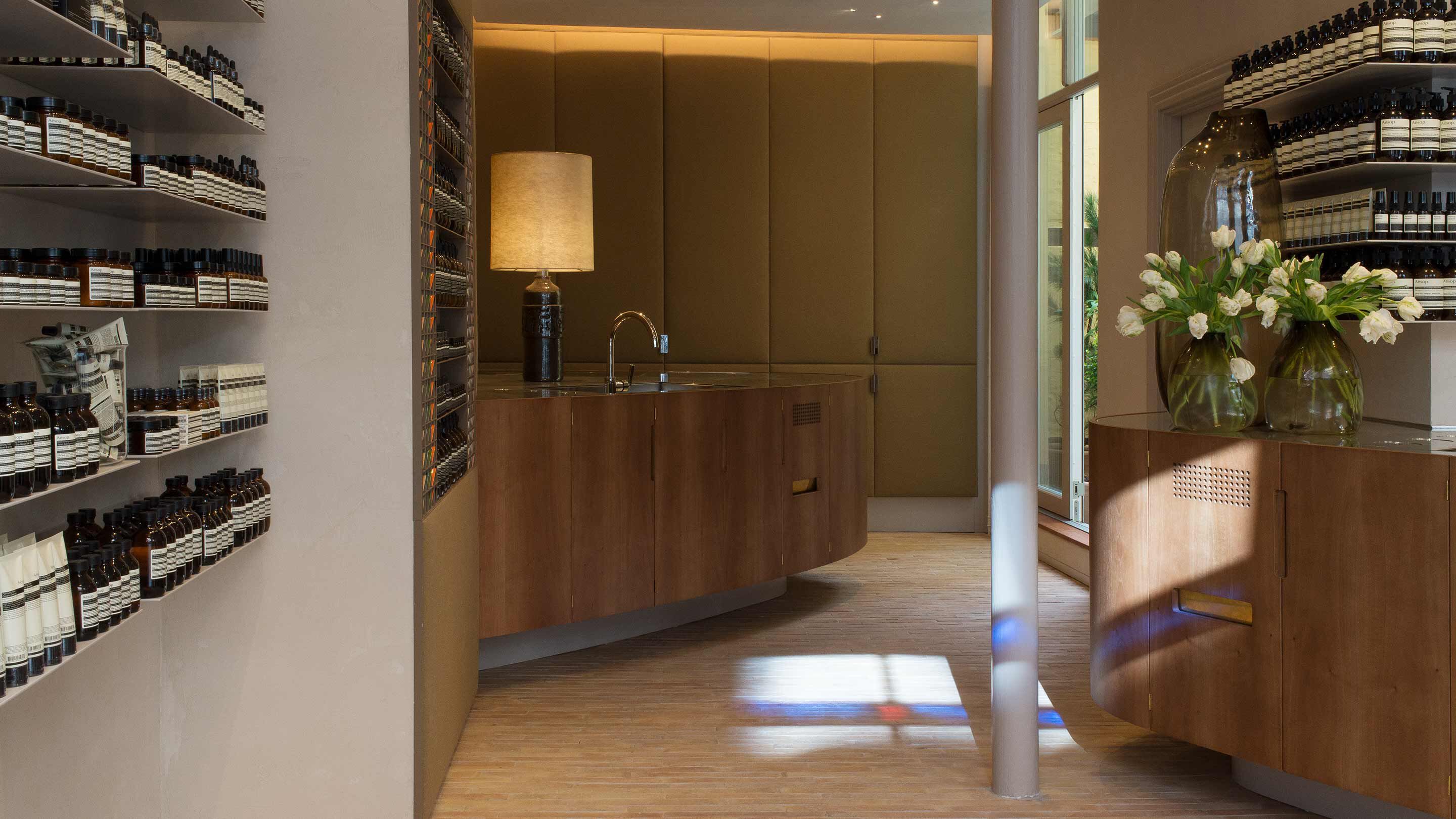 Upon entry to the store, the staggered bond of handmade, fire-burned yellow bricks maintains consistency underfoot, an extension of the surrounding cobbled streets. A warm palette is enhanced by textural contrasts enveloping the interior—the roughness of brick, shine of silver-plated brass and softness of a wool-wrapped wall.