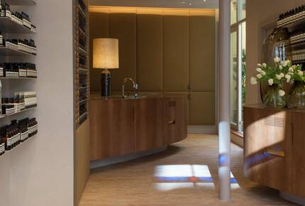 Upon entry to the store, the staggered bond of handmade, fire-burned yellow bricks maintains consistency underfoot, an extension of the surrounding cobbled streets. A warm palette is enhanced by textural contrasts enveloping the interior—the roughness of brick, shine of silver-plated brass and softness of a wool-wrapped wall.