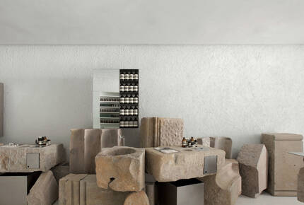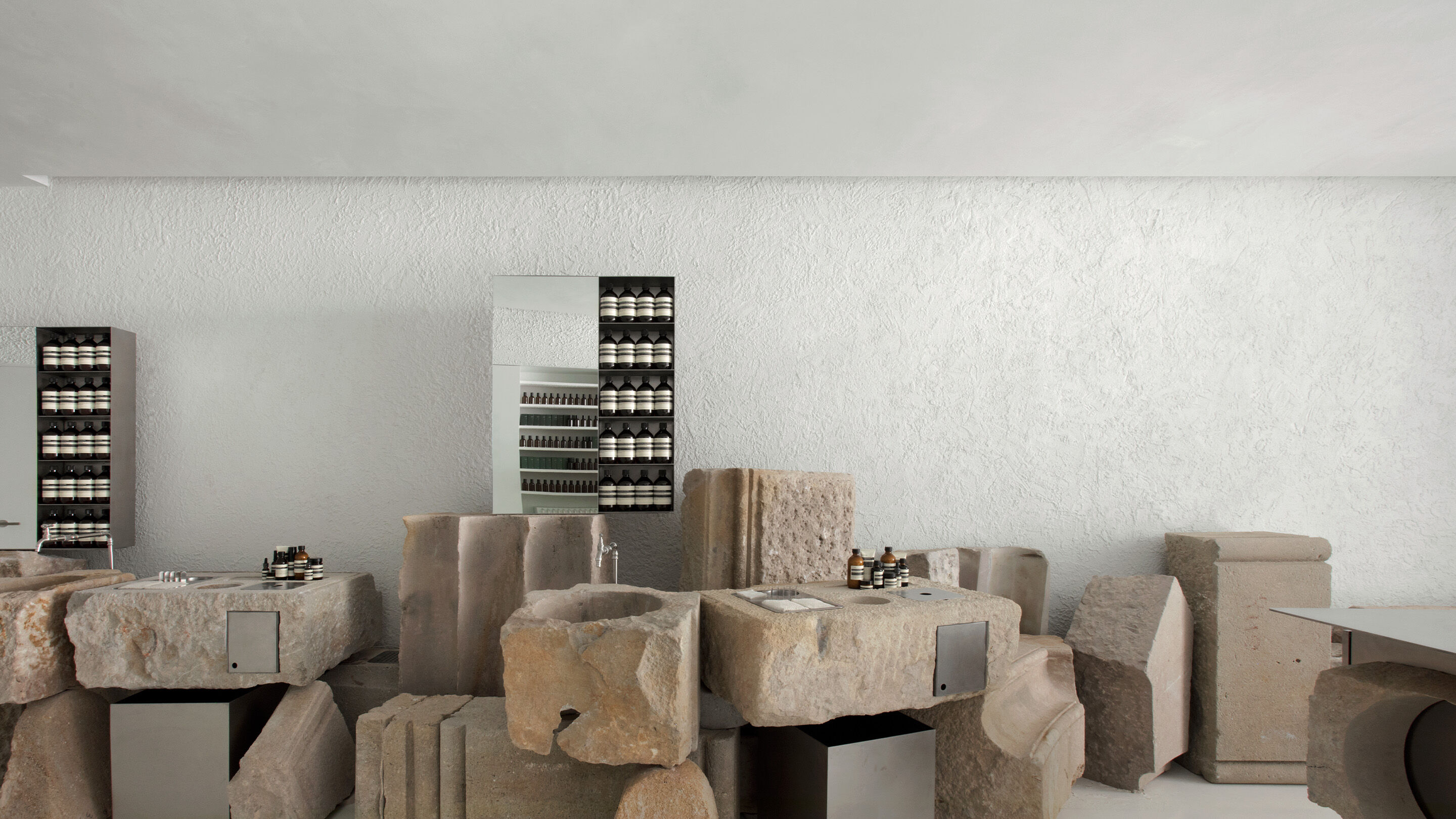 The project gives prominence to the creamy, sedimentary rock that supports the exploration of our unconventional formulations. The shell of the space is cast in textured stucco that resonates with the blocks’ warmth, while stainless steel shelves, taps and other functional fixtures bring a cool precision to the gestural forms. At the basins—wells hewn into the found Montjuïc chunks—customers can encounter formulations best suited to their individual needs. In the depths of the store, an expansive, custom-made sofa recalls the stacking of un-carved boulders. Customers are invited to repose on the distinctly soft surface and contemplate the contrasts of density and delicacy, memory and futurity, that this store holds in astonishing equilibrium.