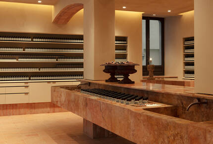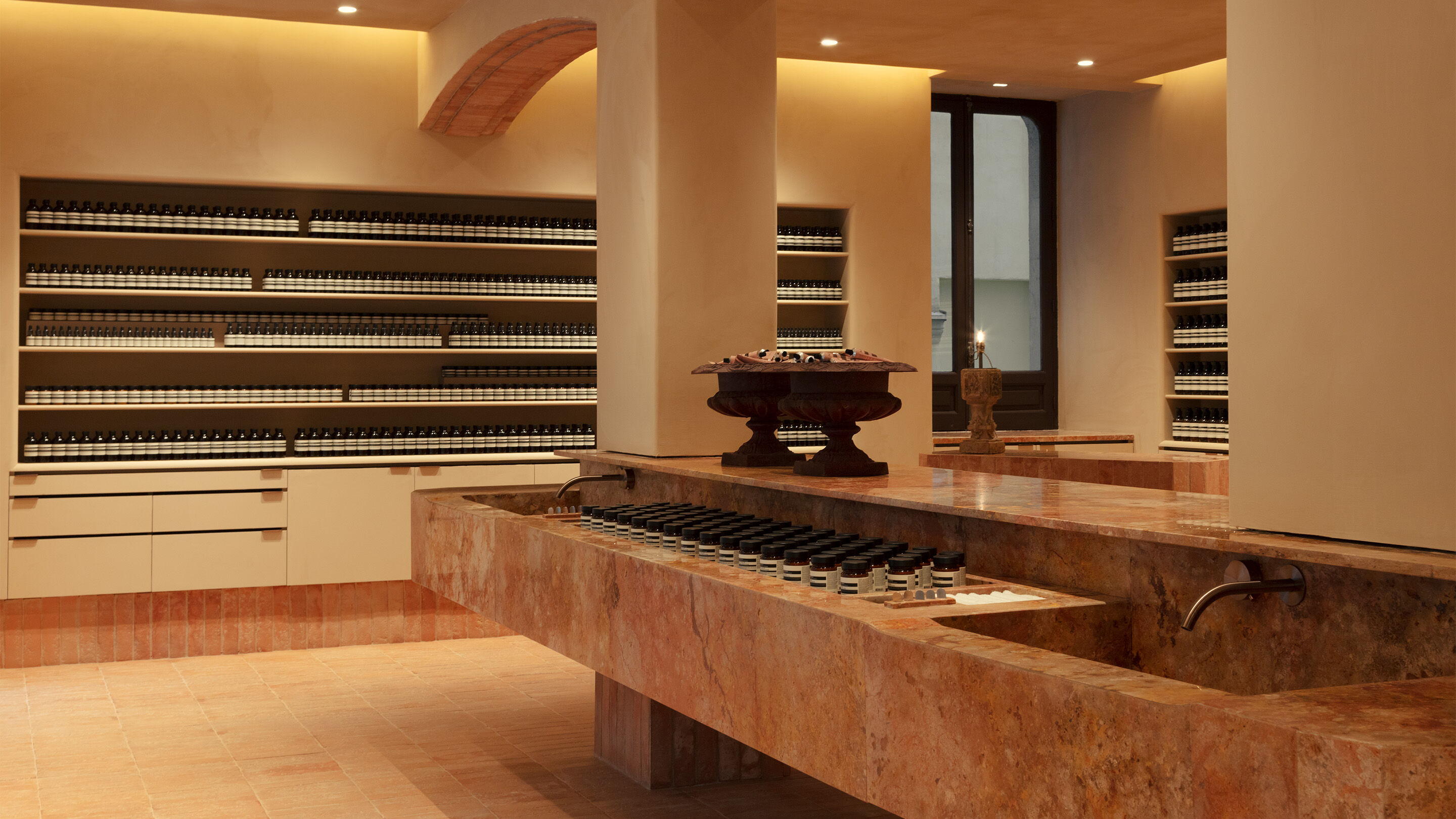 Following our customary attitude of architectural restraint, the 1923 building’s neoclassical façade has been preserved, along with its history of residential use and mid-twentieth-century commercial transformation. An in-built system in the front window diffuses our aromas into the street, awakening the olfactory sense of passers-by. Product testers in the portico serve as a prologue to the warm-hued interior where soft arches and decorative tiling evoke Madrid’s Moorish legacy and neo-Mudéjar architecture. A convivial basin of red Spanish travertine embraces two central columns and becomes the focal point for all interactions.