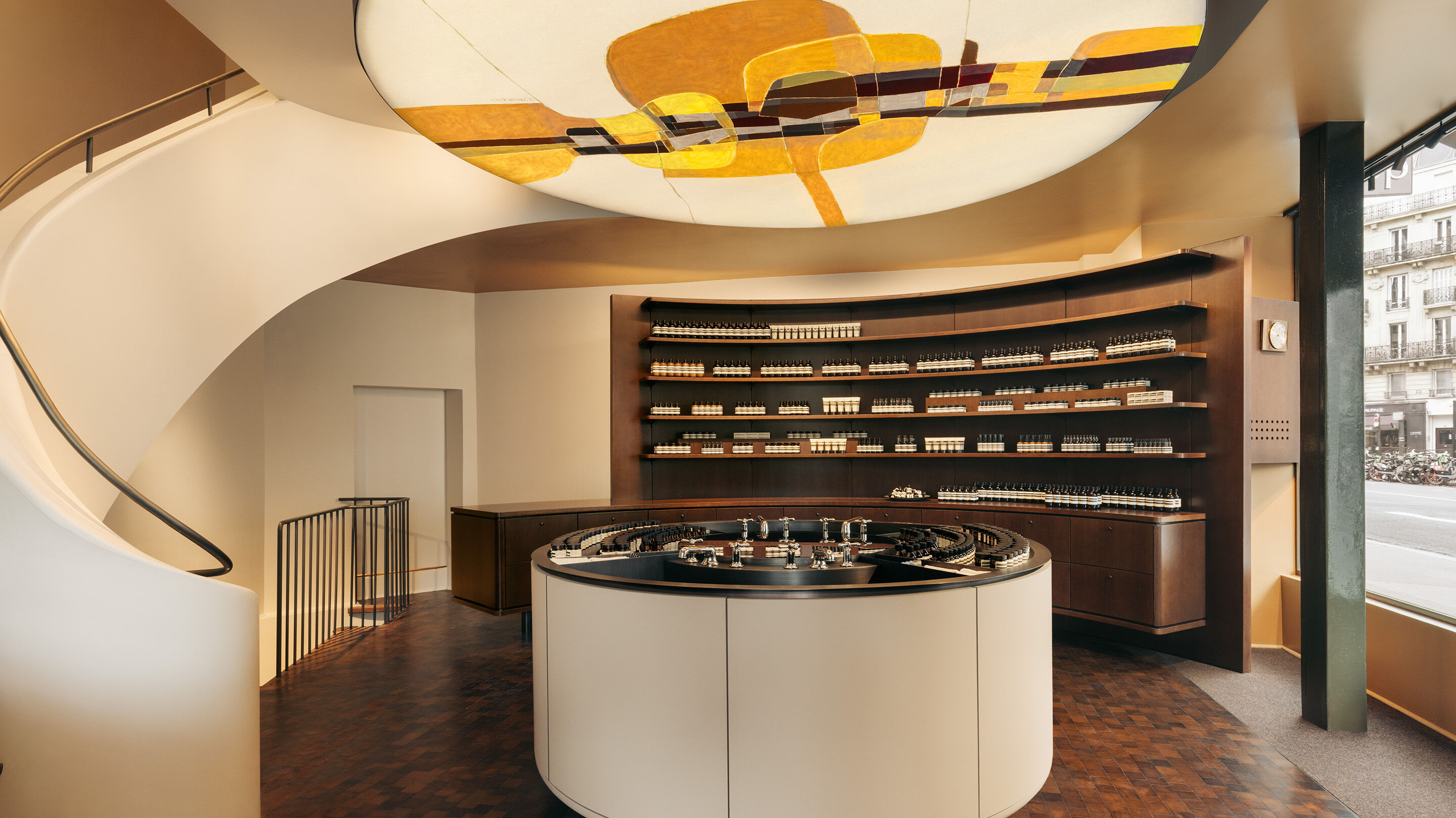 Set on a bustling corner at the beginning of Rue de Sèvres, the store centres on a sweeping staircase which invites customers up to a series of rooms for personalised consultations. As this architectural gesture softly blends into the ceiling, its curvature forms a frame of sorts for a large-scale artwork that is suspended from the ceiling. The abstract piece is by painter Roland Schaller, a self-described ‘dreamer who forgets to grow old’, whose essence imbued the design of the store as the Aesop team worked with him over a year to commission the work—an experience composed of long dinners, philosophical discussions and generously shared wisdom. Now residing in Switzerland, Schaller once studied at l’École des Beaux-Arts de Paris and busked with his guitar in Saint-Germain-des-Prés—two landmarks of the surrounding area—while the colourful landscape depicted in the work draws on his years spent in Provence.