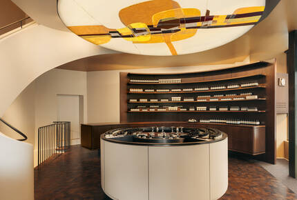 Partly illuminated from the backlit artwork above, the ground floor is given structure by a series of dark stained oak forms that nod to the decorated screens sold in the area’s many antique shops. A backdrop of uniform off-white coats the walls, while a splash of bright orange underneath the staircase echoes the colour palette of Schaller’s painting. Within the consultation areas above, the mood becomes more intimate and domestic with shuttered windows, a carpeted floor and a Fragrance Armoire—a unique piece of furniture that plays host to our range of unconventional Eaux de Parfum.