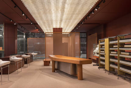 During their research for the design of Aesop Canary Wharf, our in-house team engrossed themselves in the site’s nineteenth- and twentieth-century history as one of the busiest docks in the world, while also surveying its contemporary significance as a hub for London’s banking and financial services. In the spirit of international trade, the store is an assemblage of items from across Europe—housed within a chestnut brown container. The warm, enveloping ambiance provides respite from the supercharged retail environment.
