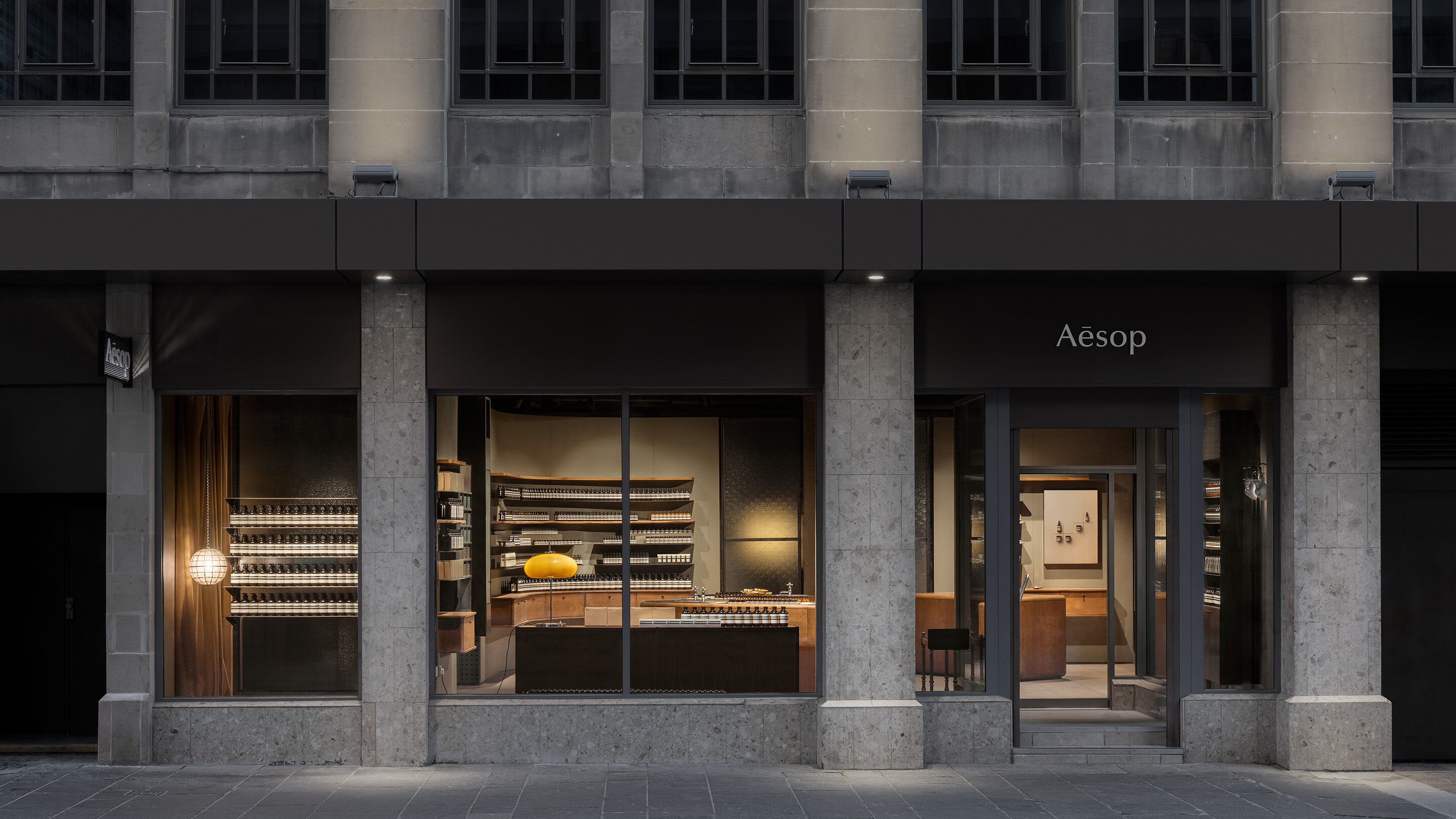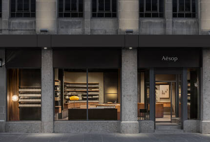 Occupying a modest lot on Ingram Street, Aesop Glasgow is a place of austere materials and muted atmosphere. The intention was to leave the shell of the unit untouched and to define the space with a straight-forward attitude and minimal intervention. Reclaimed parquetry lines the floor while a curved partition envelops visitors in our full range of formulations for the skin, hair, body and home. In the centre of the room, a generous communal basin echoes forms found in Mackintosh’s idiosyncratic architecture. Here, customers can receive tailored advice about—and a tactile introduction to—products that meet their individual needs. Tucked away to one side, behind a curtain, a cloistered personal basin affords privacy and the possibility of more in-depth consultations. Back in the main room, on the plush vintage sofa, visitors can rest awhile and muse.