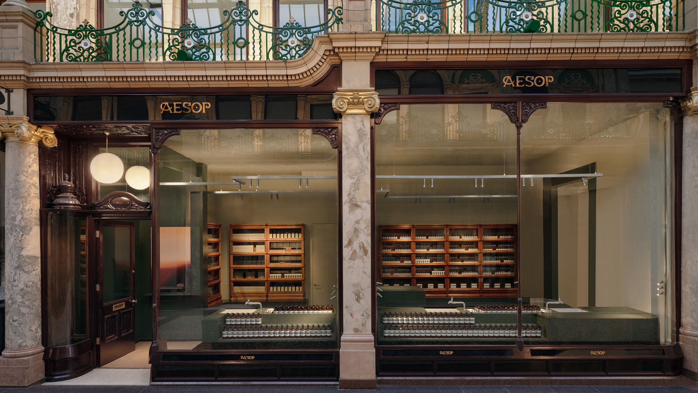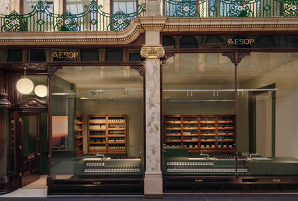 To honour the importance of these activities, the arcade’s spirit of grandeur was brought within: thresholds are articulated in deepest green, establishing a rhythm between rooms. The warm generosity of reclaimed parquetry extends an invitation to slow down, each beam elongating the perception of time with its well-worn grain. Along the back wall, vintage stacking bookshelves suggest unhurried pursuits. Instead of literary tomes, however, their glass fronts reveal the many jars and bottles of our formulations for the skin, hair, body and home.
