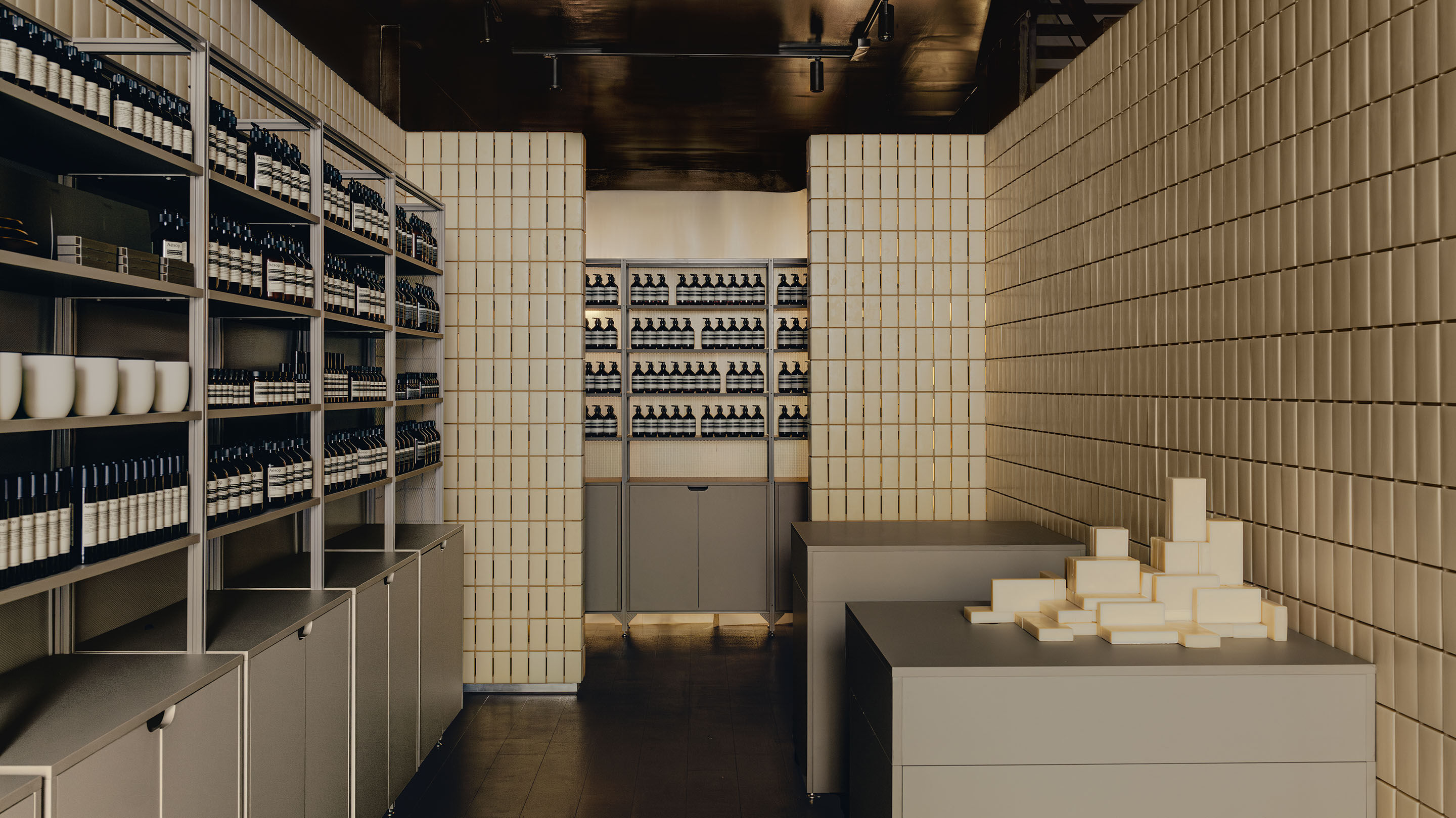 Situated on Brompton Road, the store is long and narrow. Just as practitioners of the Arte Povera movement restricted themselves to simple and everyday materials in their poetic compositions, the spatial restriction of Aesop Knightsbridge enforces a streamlined design in the form of a soap corridor that offers a pragmatic yet intriguing journey through our range of products for the skin, hair, body and home. The communal basin and display shelves are repurposed from our furniture collection, making Knightsbridge a second home for significant pieces from our past. Visitors are encouraged to tryexplore formulations directly onto their skin, with gently running water if desired, while dexterous consultants are on hand to give recommendations based on individual needs. In this atmosphere of muted calm, guests might contemplate their skin care selection or, perhaps, muse on the benefits of architectural salvage.
