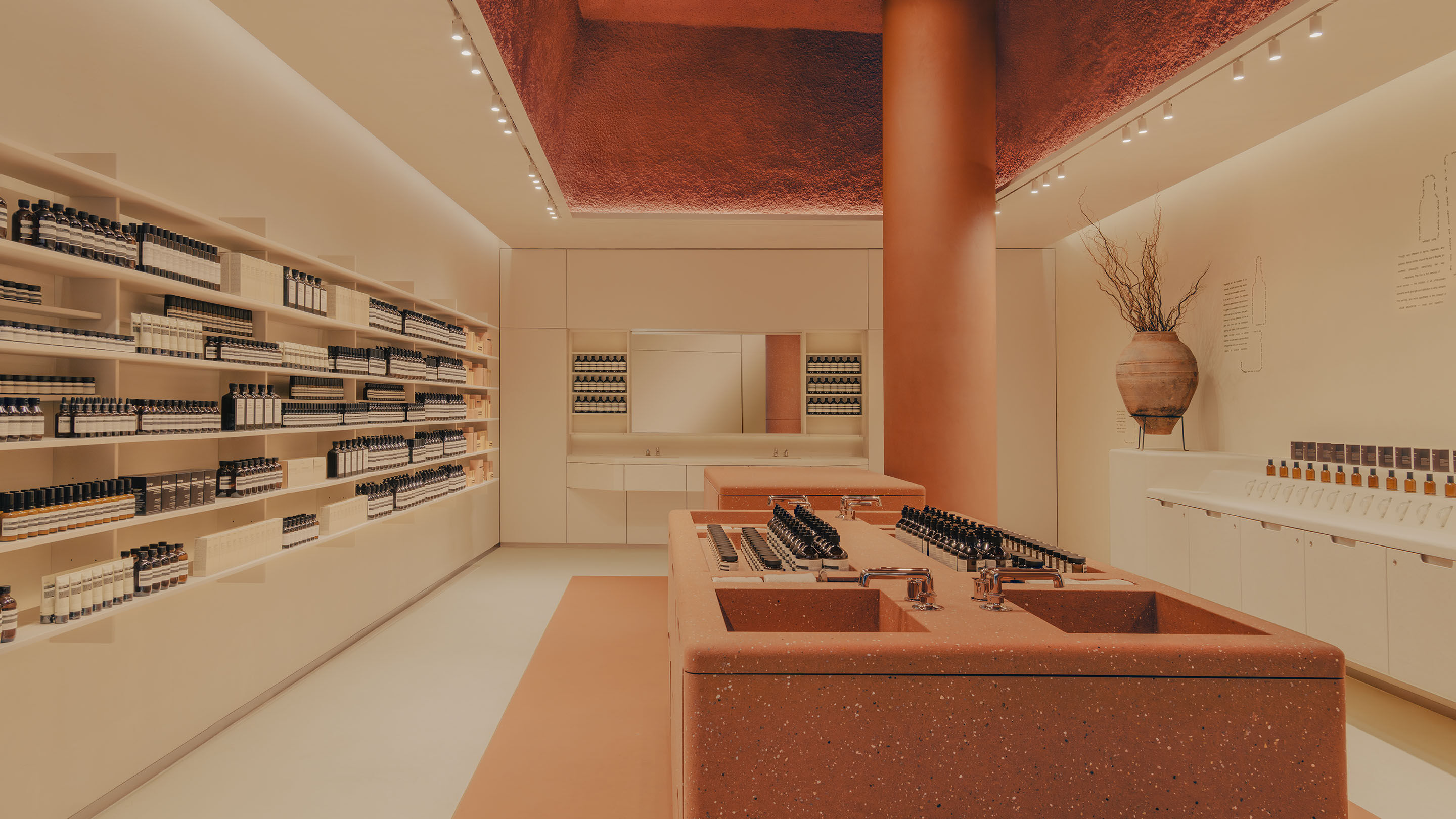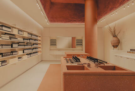 Such moments of quietude can be carved out in the central chamber of the store, which is characterised by its warm terracotta hues and dramatically vaulted ceiling. Acoustic plaster on high creates a hush conducive to meditative explorations of our formulations for the skin, hair and body at the communal basins—with flowing water, if desired. A distinctive ambulatory passage in crisp ivory tones surrounds the heart: here, patrons can peruse the full range of products, including fragrances for the self and home. Two individual basins allow for a degree of privacy during in-depth consultations. Above the shelf devoted to our non-conformist Eaux de Parfum, words of wisdom taken from the Aesop Book are fashioned into a form of concrete poetry.