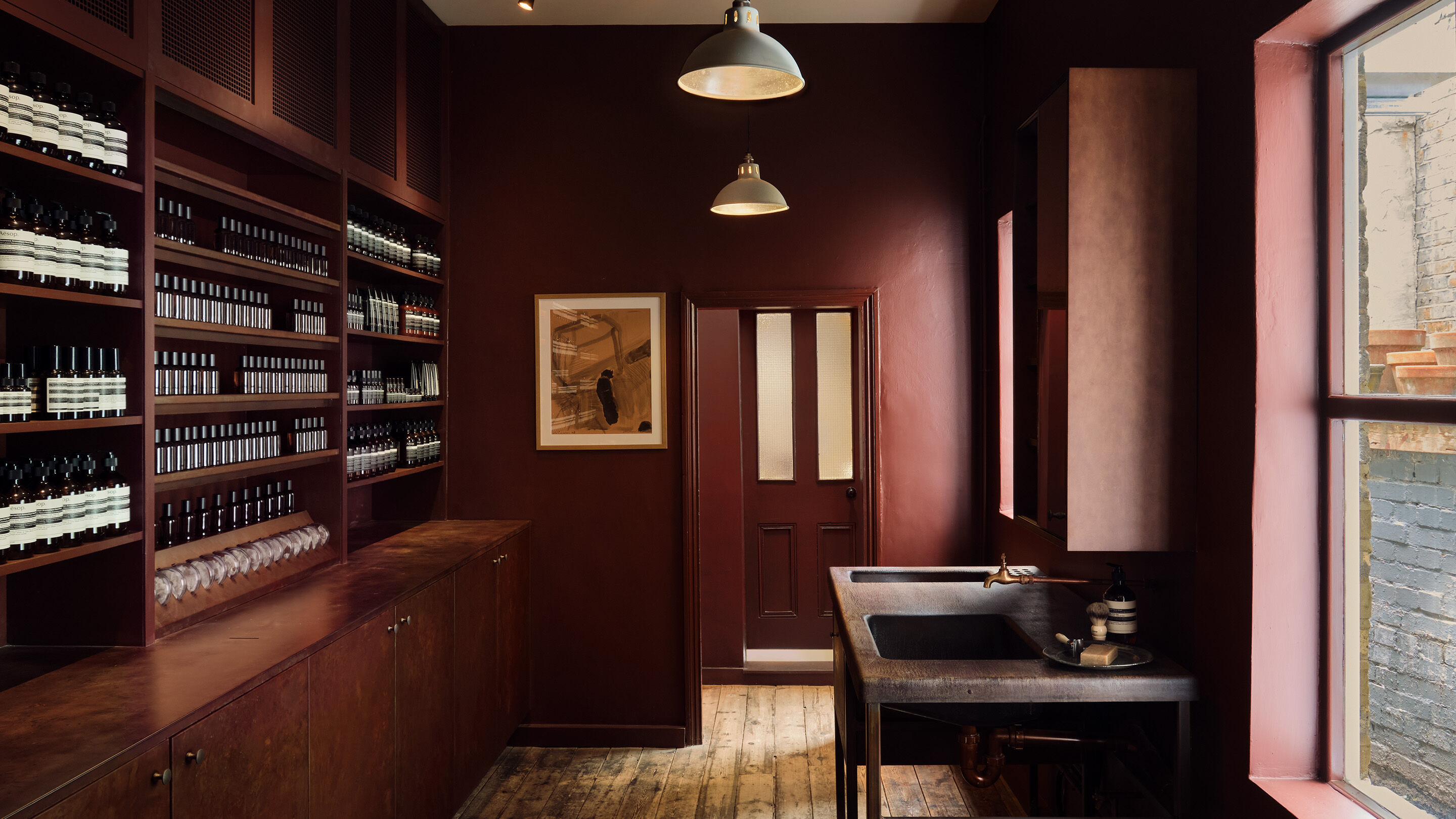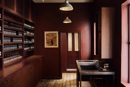 In their investigations, JAMESPLUMB were intrigued by the textures of the kerbstones and pavement details of Redchurch Street. Layers of materials that have accumulated over years of roadworks, bush-hammered granite, cast-iron grates, chipped glass bricks—weathered and worn by the elements and foot flow. An encounter with an iron foundry proved fruitful. Close collaboration with the artisans led to the development of bespoke basins that reference the store’s former enamelled troughs, the subtle texture from the sand-casting process echoing some of those found on the street. 3D scans of Redchurch Street’s kerbstones were used in the casting of a countertop that quite literally brings the gutter to the table. The brackets that support rows of shelves were also cast in iron, their tapered form taken from a fixture found in a nearby market. Arranged neatly on these understated supports are our products for the skin, hair, body and home—some known intimately already, others new acquaintances.