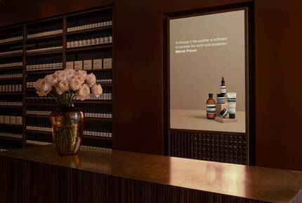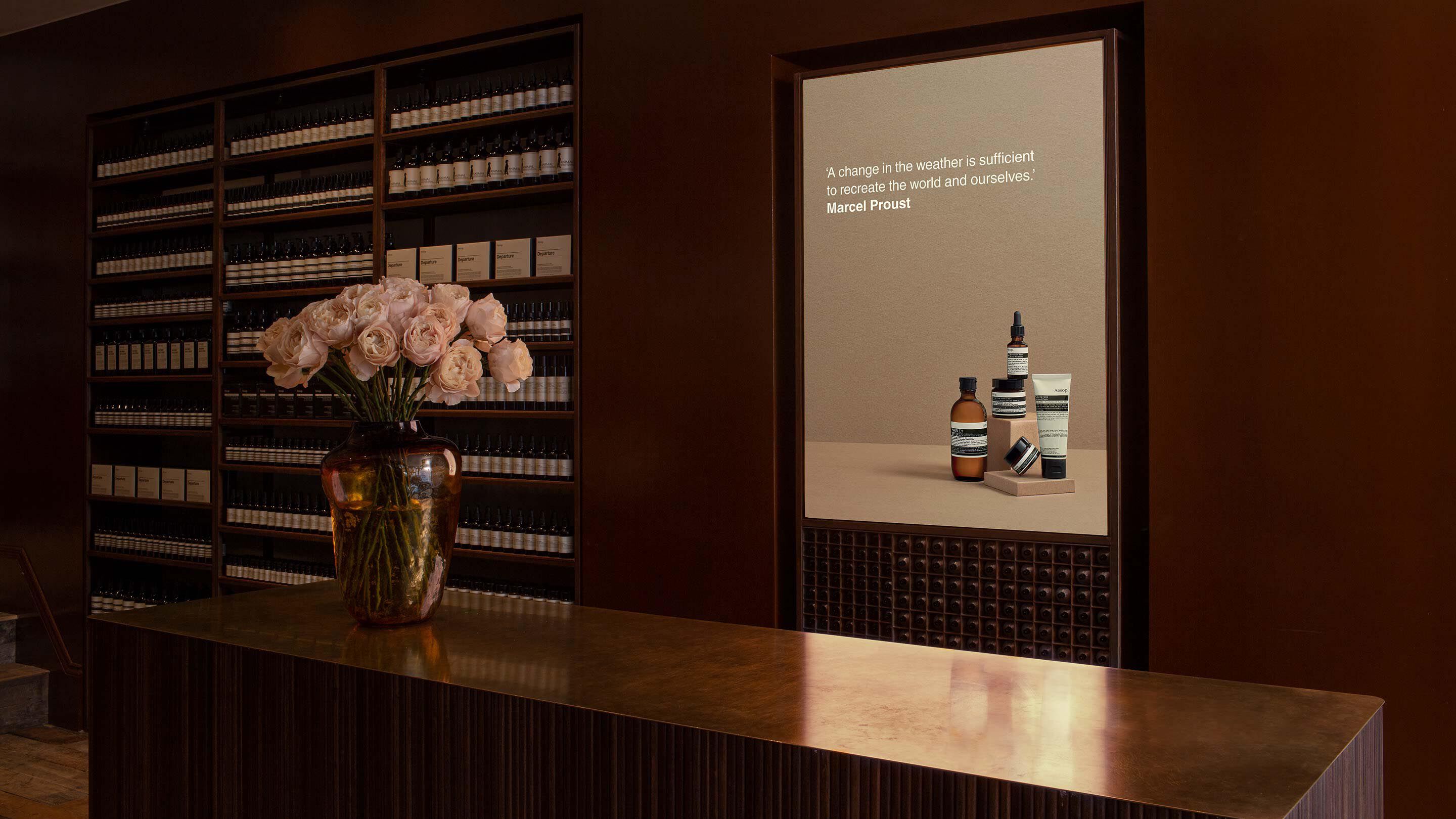 Aesop Seven Dials inhabits the central terrace of a trio on Monmouth Street, one of the seven roads that converge around a sundial pillar in the heart of London’s West End. Nestled between two richly-hued shopfronts, alabaster arches frame our façade window and inform the curved language of the interior walls.