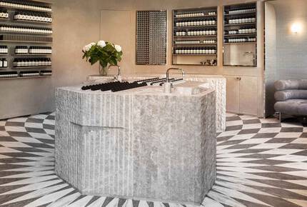 Once inside, two boulders interlock to form a central basin around which stone tiles radiate geometrically in a nod to the architectural heritage of Greenwich. A singular sink nestles into the exposed window, providing an unconventional view onto Piccadilly.
