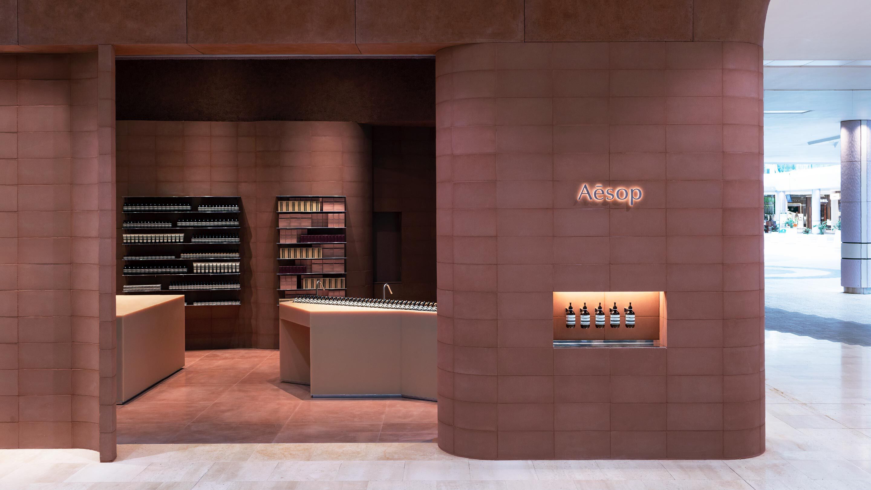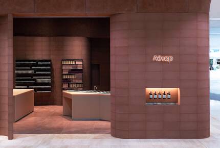 Aesop Shepherd’s Bush in London, designed in collaboration with Al-Jawad Pike, is imagined as a walled garden, providing refuge from the bustling retail centre environment. A serpentine screen meanders around the perimeter of the space, referencing historic crinkle crankle walls built by Dutch engineers in the fen country of East Anglia. The sinuous form gives rigidity to a single layer of clay blocks, creating a sense of suspended movement against which aluminium shelves appear to levitate. At floor level, angular furniture is clad in honed resin that contributes translucency and soft tactility to the otherwise mineral and metal store.