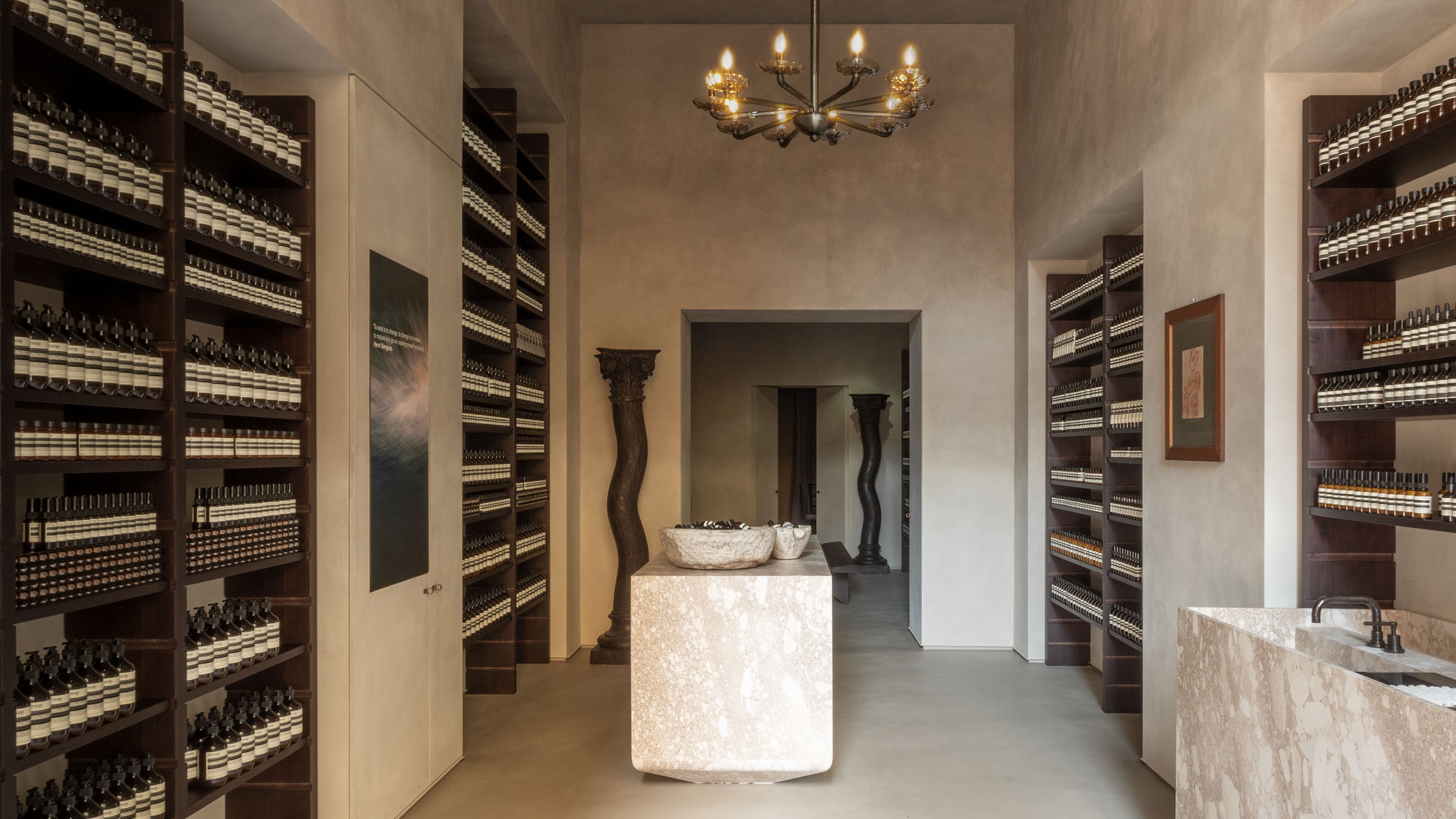 In the second section, the ceiling is brought to a more intimate height; the light dims and one’s pace slows, allowing for more detailed product studies. The third, semi-private room is a staff kitchen: with its doors held ajar, this functional space is the tantalising focal point of the store’s extended enfilade.