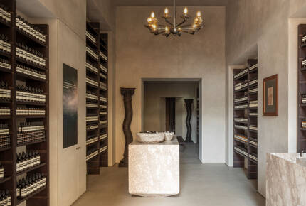 From the street, soft linen curtains frame a dramatic view through a suite of adjoining rooms. The symmetry of the floorplan is disrupted by the changing heights of passages, halls, and nooks—a play of compression and expansion defines the space. In the first chamber, towering walls are finished with the ancient technique of Encausto Fiorentino. The lime plaster’s pigment fades from ceiling to floor, making visible the many hours of skilled labour this delicate craft demands. Muscular shelves of dark-stained Mediterranean Pine were created with the simplicity of interlocking boards, suggesting the functional apparatuses of design studios. Travertine monoliths appear to be waiting for a sculptor to begin their work.