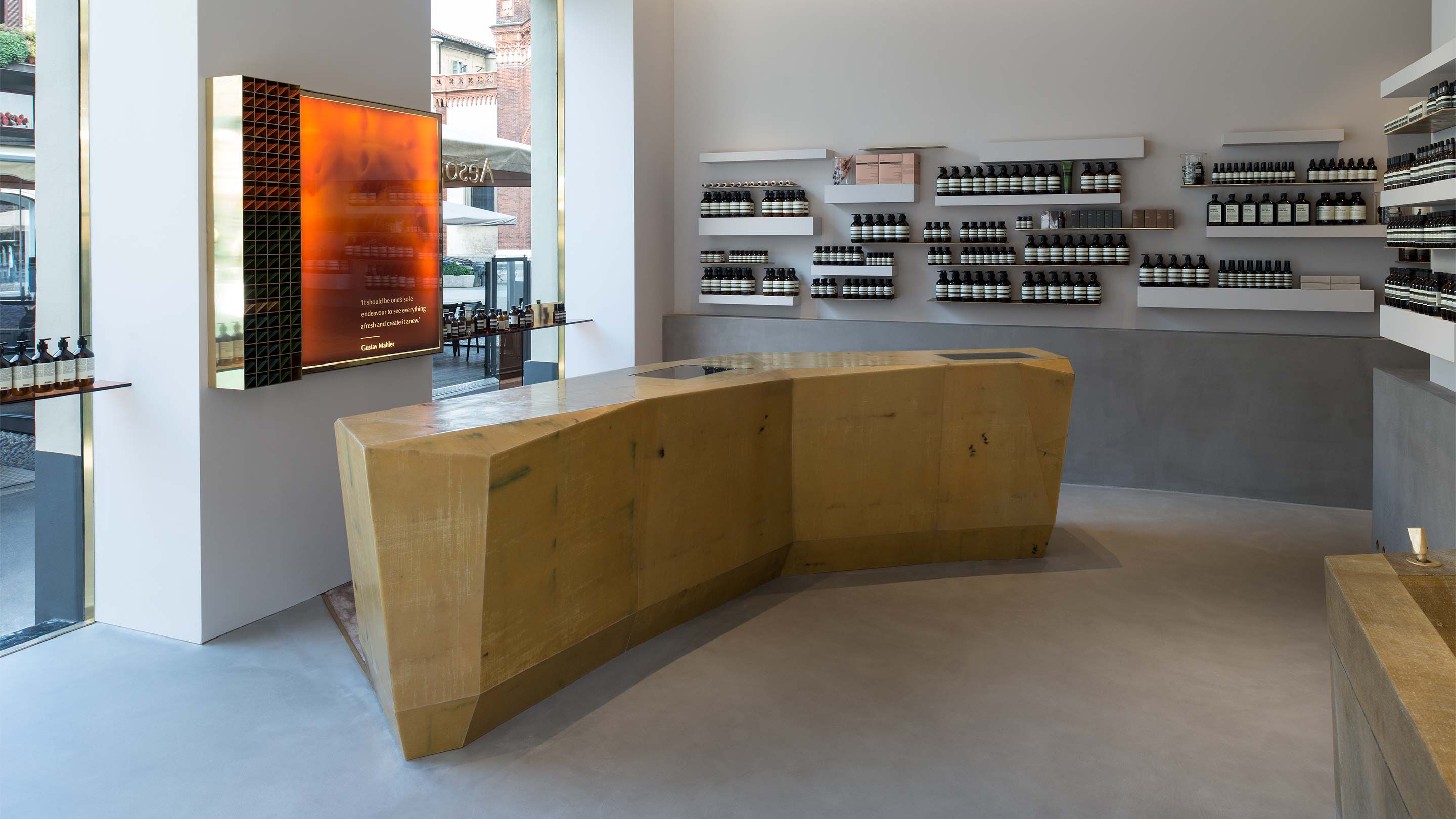 The palette is dominated by neutral tones: pale peach plaster features on walls and ceiling, while the balustrade and concrete floor are of calming grey. The serene qualities of these elements are contrasted by asymmetrical textured cast aluminum display shelves. Functional and minimalist, they pay discreet respects to Milan’s industrial roots.