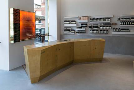 Further contrasts emerge from the sculptural point-of-sale counter and product demonstration sink—two quietly imposing forms of moulded fibreglass. Beyond the retail area lies a modest workspace furnished with restored vintage pieces and a large table reminiscent of the former occupancy.