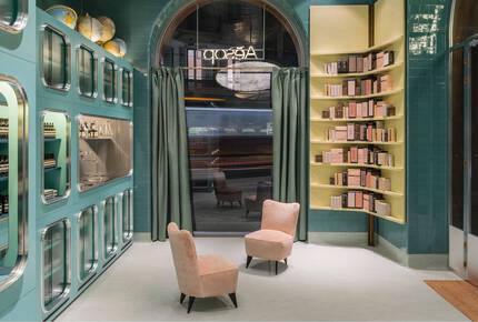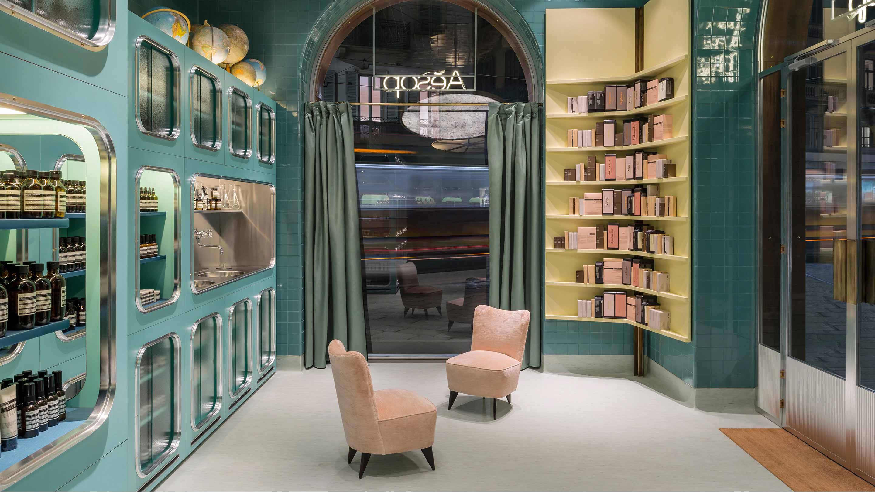 Muted greens, yellows and pinks herald the trip back in time. Glossy teal subway tiles cover the planes and arches of the ceiling, contrasted with lemon-yellow corner shelving. Product display cabinets are of the same green tone. Soft grey linoleum covers the floor, complemented by two mid-century velvet-upholstered chairs and a stainless steel demonstration sink, a further echo of domesticity.