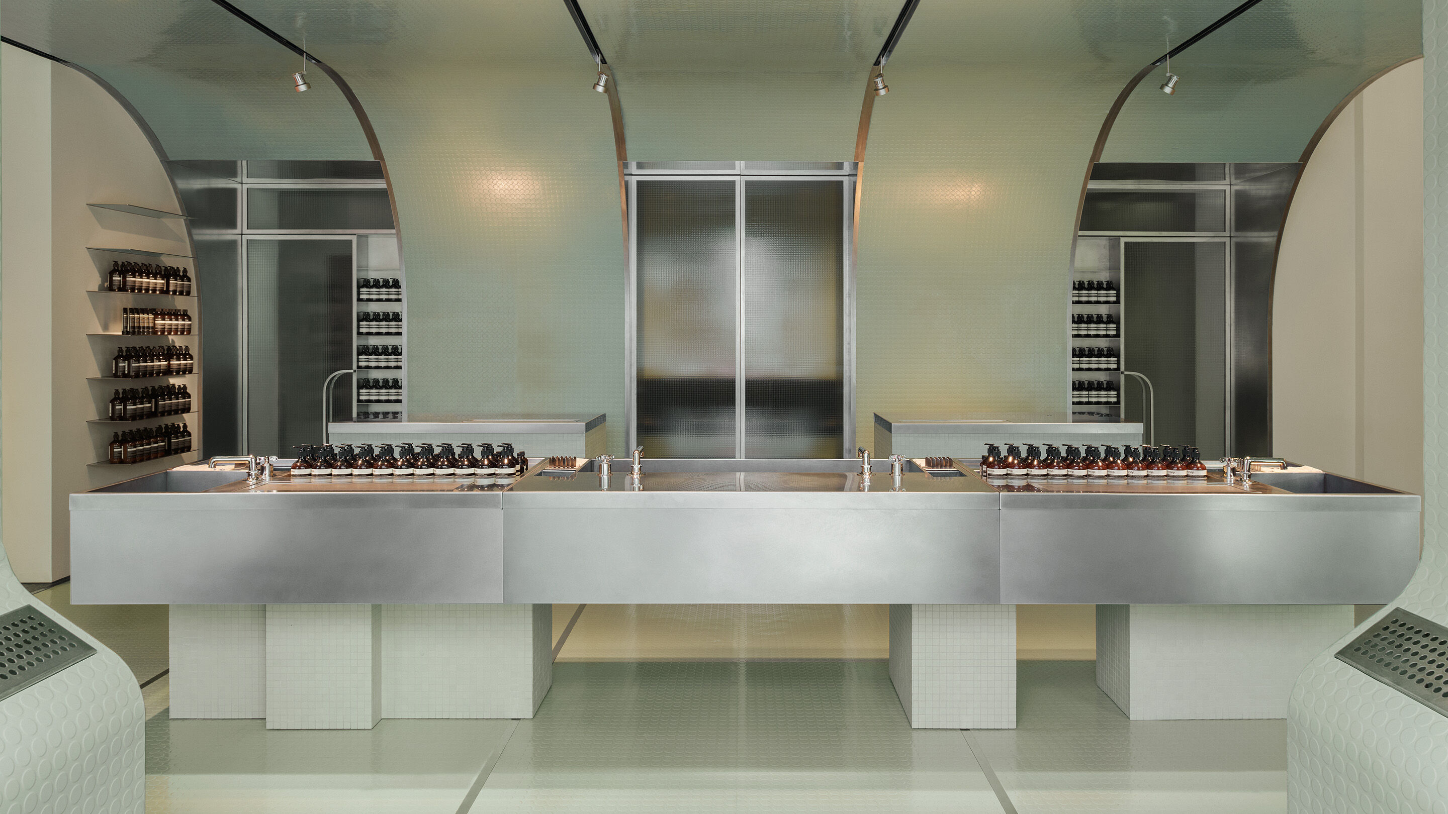 Through a central portal, an intimate underground carriage of sorts is revealed: an ample velvet seating booth beckons to weary ramblers, while two individual basins accommodate in-depth journeys through the Aesop range.