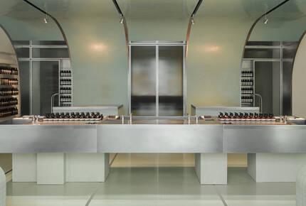 Working within the framework of a century-old building, our store transports visitors into an abstracted tunnel of studded rubber. The insertion is conceived as scenography, with each element designed to be modular and adaptable so that the space can be transformed into a cultural stage or public forum. As an ode to their fundamental functionality, services that run across the ceiling are highlighted in red rather than hidden. At the expansive linear basin—an exalted interpretation of the public wash station—passers-by are encouraged to linger for convivial encounters with our nonconformist formulations for the skin, hair, body and home.