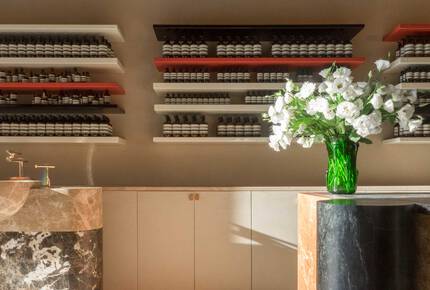 Three tones of travertine cover the floor in a rhomboidal pattern in subtle homage to the interior of the church of San Lorenzo in Lucina. The internal furniture is construed as blocks inlaid with regionally sourced. Architectural straw sheaves articulate the ceiling, inspired by the thatched roofs of houses common during ancient times to the Agro Pontino outside the city.