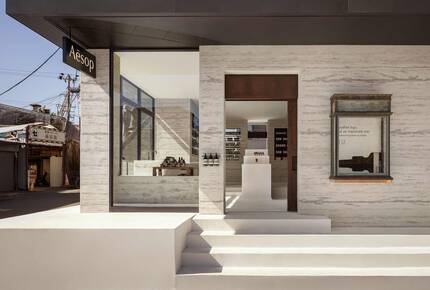Created in collaboration with Simplicity Design Studio, the interior of Aesop Kamakura holds diverging qualities in dynamic equilibrium. This organising principle was inspired by the coexistence of opposites found throughout the ancient capital, where precipitous mountains abut the open ocean, and historic temples that recall thirteenth-century shogunate power jostle with early-twentieth-century villas designed for seaside recreation. In a similar way, one half of our store is open and bright, while the other is muted and moody; one expresses the sedimentation of the local geology while the other articulates the atmosphere of Kamakura Bunko—a famed book rental shop which fostered artistic and intellectual enquiry in the 1940s.
