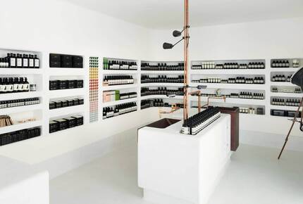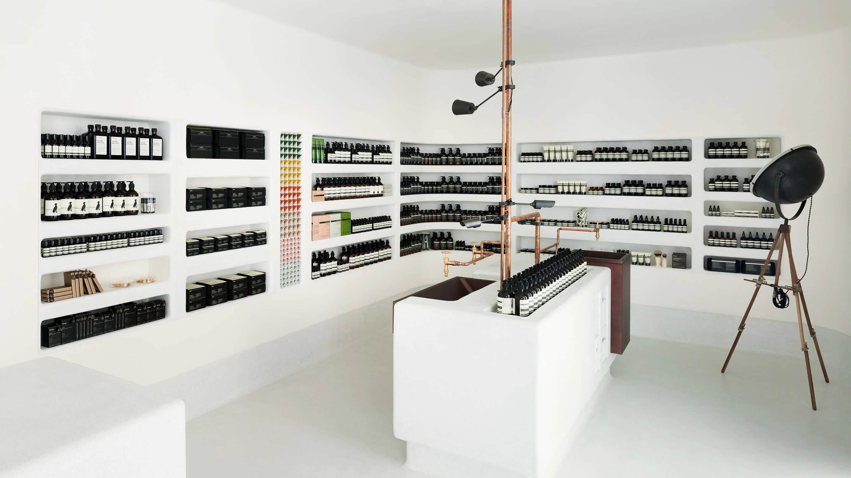 A black-and-white palette effects play of light and shade throughout the interior, articulated by a veil of blackened mesh that demarcates the entrance corridor from the retail area; our signature bottles are sewn through the fabric in calligraphic order. Also denoting respect for tradition, the interior is anchored by a central island housing a demonstration sink fitted with copper plumbing.