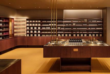 Echoing the golden carpet of ginkgo leaves that appears on surrounding streets during autumn, a vibrantly hued cashmere floor invites visitors into Aesop Kyoto Takashimaya—a space of gentle curvature, rich tactility and hushed tranquillity.
