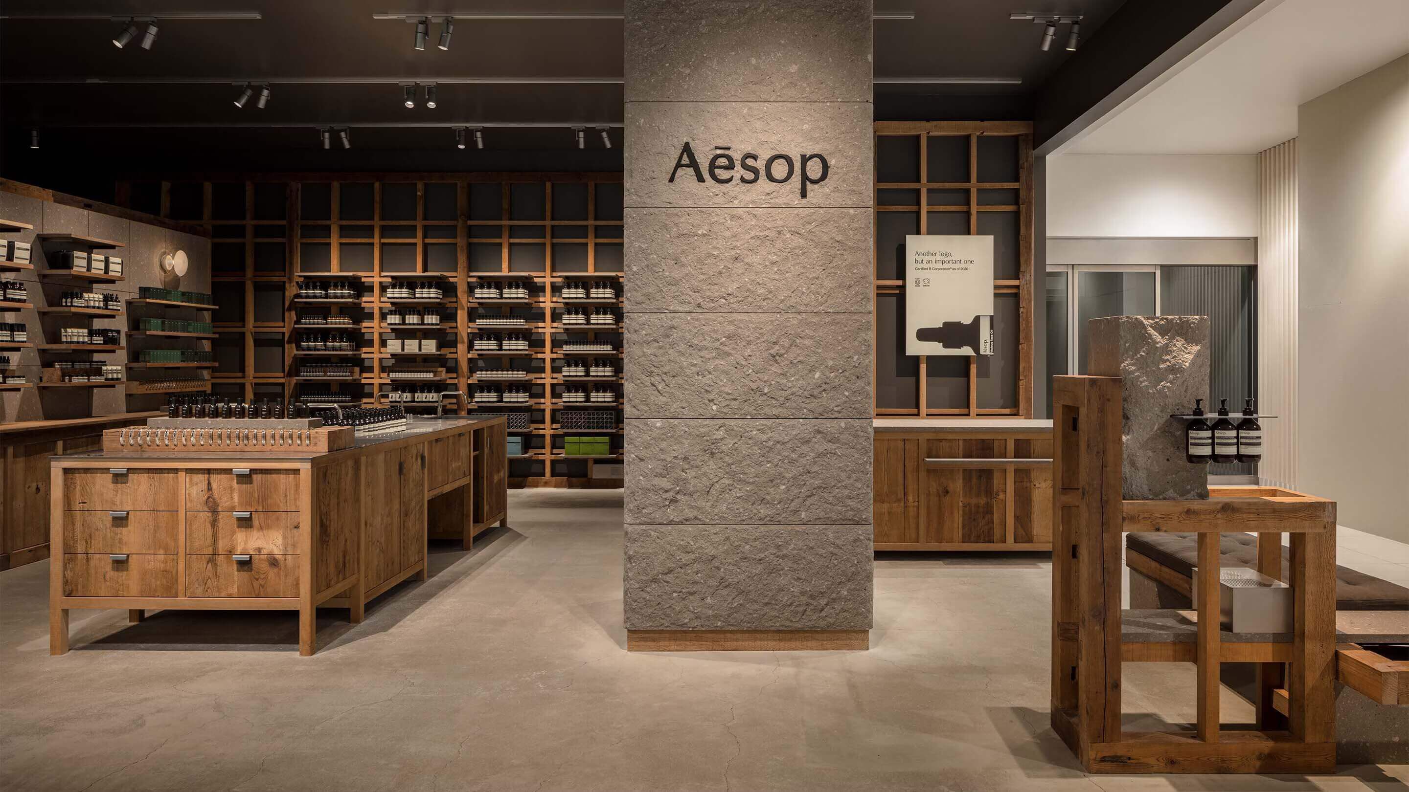 For those who wish to rest awhile, a bench made from reclaimed timber fragments and solid blocks of Sapporo Nanseki stone offers ample support. From here, customers or passersby can contemplate their selection of Aesop formulations and the lifecycle of nonconformist retail architecture.