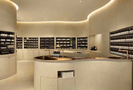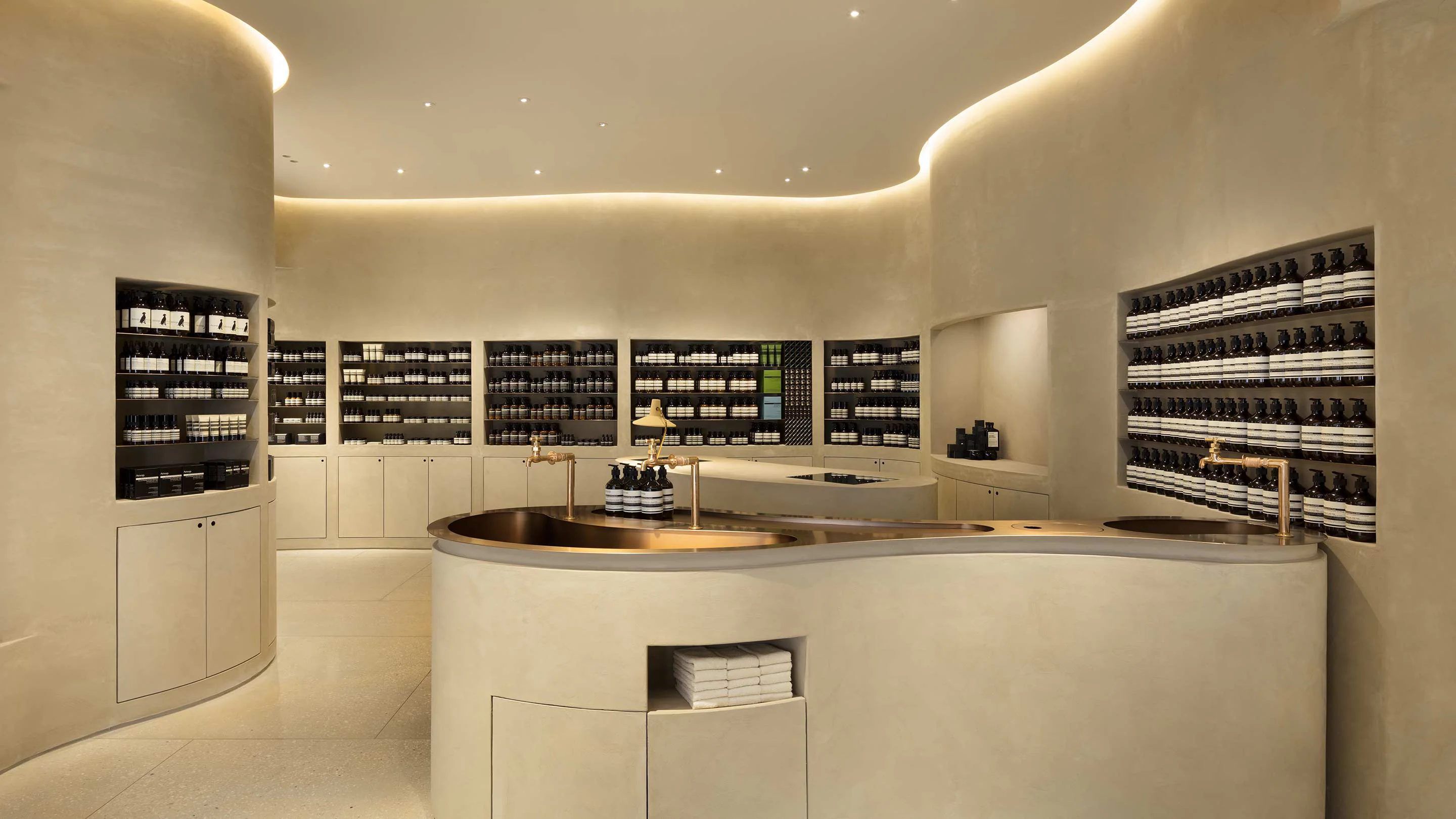 An island with curved contours houses two demonstration sinks and a sales counter, and underscores the store’s soft line of flow. Giving discreet emphasis to product display, golden iron shelves have been carefully embedded into the plaster walls by expert hands. A tester display area with the same metal finish effects subtle prominence for consultations.