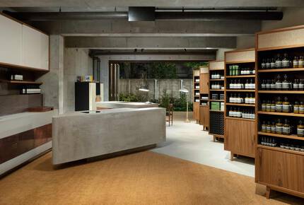 The interior’s domestic geometry is immediately apparent care of a glazed façade that leads the eye from the entrance to a courtyard garden. Product display cabinets crafted in Teak and woven washi paper line one side of the space; opposite, clients can sample formulations at a patinated brass trough. Furnishings redolent of a 1950s family home offer a reassuringly familiar accent.