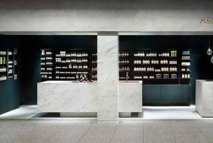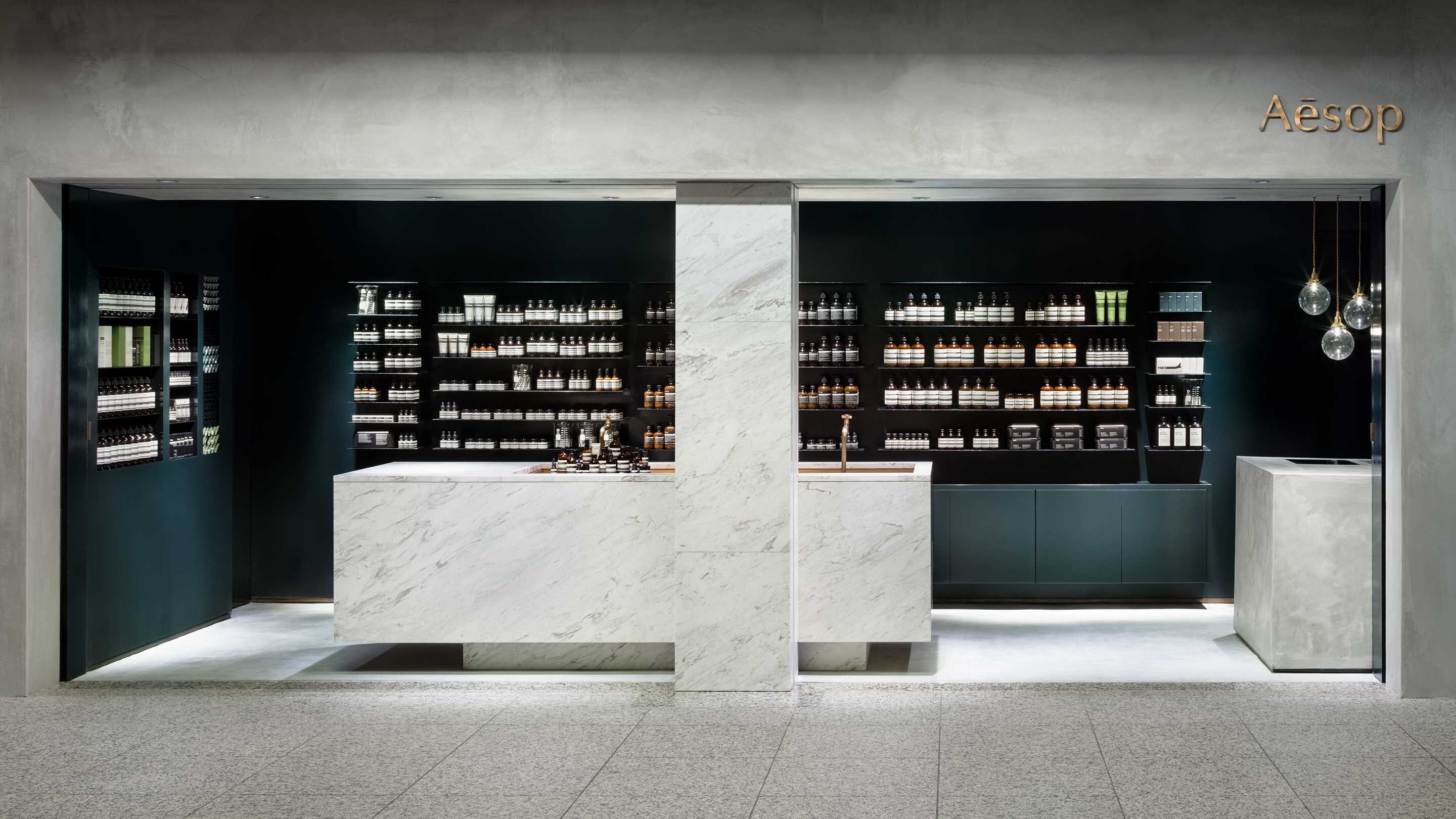 The interior is read as a collection of planar surfaces, their angular interfaces animated by shifts in tone and materiality. Storefront framing is clad in mortar, offset by the aged brass lettering of the Aesop logo. Inside, the cool neutrality of the façade is also manifest in the glossy finish of the side walls.