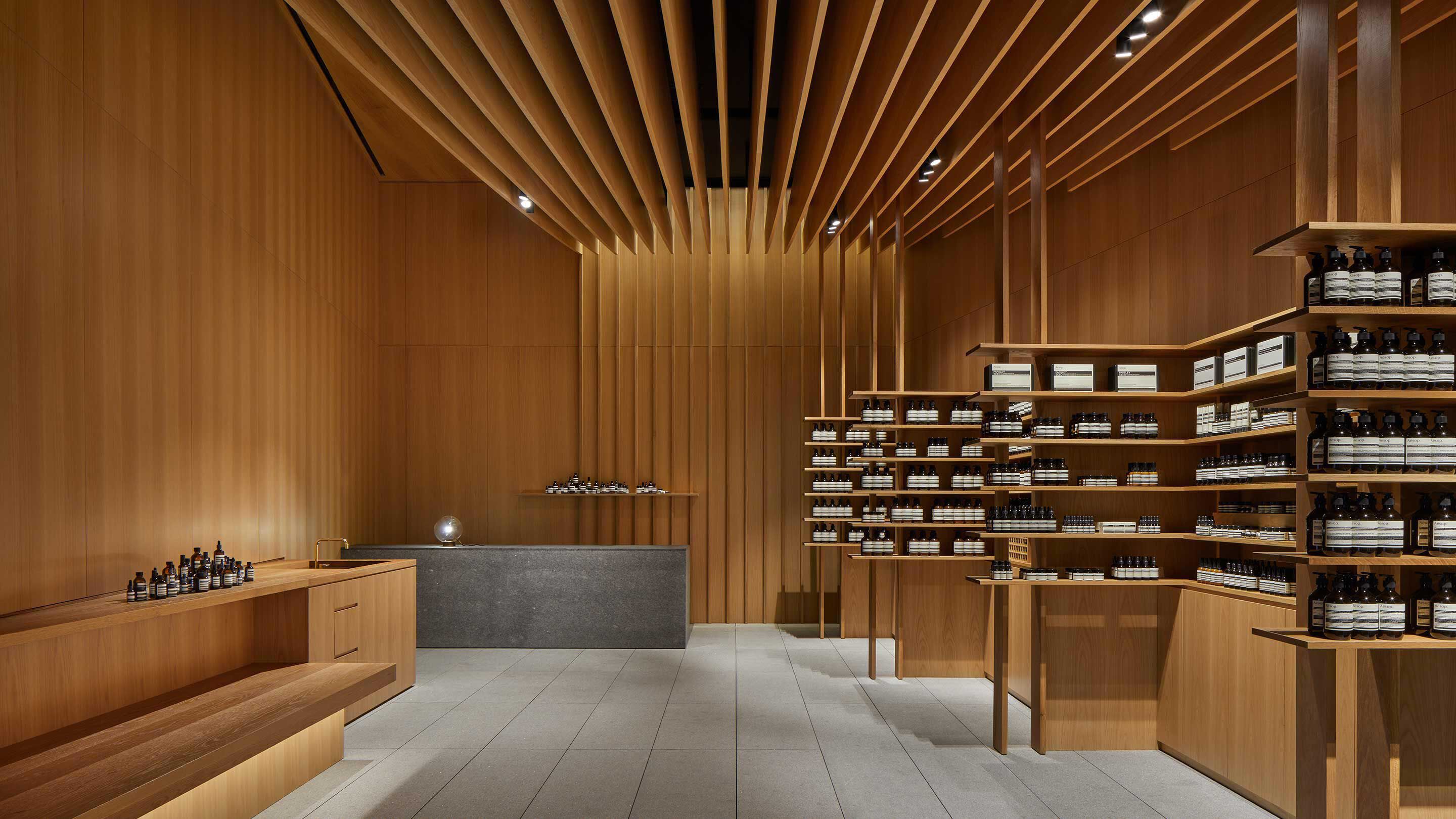 이솝 롯데월드몰 스토어를 디자인 한 서아키텍스는 한국의 전통 가옥인 한옥 요소를 추상적으로 표현하고 마루를 상징적으로 확장시켜 기분 좋은 안식처 공간을 조성했습니다. 입구의 깊은 처마는 고객을 재생 목재와 거칠게 다듬은 석재로 이루어진, 친숙한 안마당으로 이끌어줍니다. 목재 슬레이트는 천장에 비스듬한 각도로 매달려 아늑한 효과를 주며 수직의 리브가 지그재그 배열의 선반을 표현합니다. 대형 석재 싱크는 제품을 탐색하고 음미할 수 있는 공간을 제공하고, 반대편에 위치한 낮은 높이의 벤치는 사람들이 모여 앉는 친숙한 평상을 연상시킵니다.