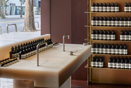 서울 곳곳에서 볼 수 있는 한국의 전통적인 주거 양식 한옥은 현대적인 건축 형태에서는 좀처럼 느낄 수 없는 환대하는 분위기를 연출합니다. 디자인 단계에 적용한 몇몇 한옥 건축 양식을 매장 파사드에서 찾아볼 수 있으며 그런 가정적인 느낌은 스토어 안으로 이어집니다. 옻칠한 목재 패널은 따뜻함과 부드러움을 전하고, 복잡한 철물은 한국 전통 가구 반닫이를 참고했습니다. 매장 곳곳에 넉넉하게 좌석을 두어 여유로운 분위기를 더합니다.