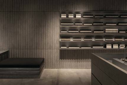 Cast concrete acts as a counterpoint—vertically ribbed walls mirror the furrowed tin; two rectangular counters float between rows of shelving. The basin and test product display are set into the concrete as indented corrugations. This simplicity of materials communicates gratitude towards our Kuala Lumpur customers.
